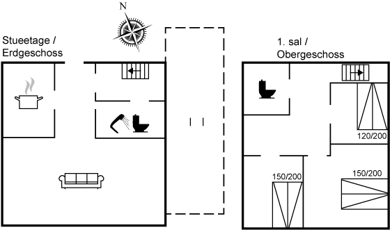 Der er badeværelse med bruser, toilet og gulvvarme i stueetagen og et toilet med gulvvarme på 1. sal. I stuen er der TV med Dongle + adgang til Netflix, Disney+ og ViaPlay i stuen, hvor der er adgang til danske, svenske, norske og 5 tyske kanaler. Desuden findes DVD/BlueRay-afspiller.