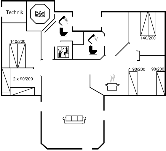 Sommerhuset er udstyret med to badeværelser, hvor du i det ene finder et stort spabad samt sauna. Fra dette badeværelse er der desuden direkte adgang til terrassen. Hører du til den mere friske del af befolkningen, er det en fantastisk oplevelse at ta’ en dukkert i Vesterhavet efterfulgt at en velfortjent tur i saunaen – uanset årstiden! Tilhører du den anden del af befolkningen, så kan du skrue op for luksus og velvære, når du lader dig omslutte af spaens varme vand.