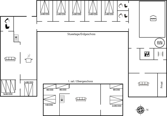 Charmerende landsted i naturskønne omgivelser tæt ved Stauning og Ringkøbing Fjord Det smukke landsted Fruergaard ligger midt i åbne landskaber med masser af plads og ro. Til huset hører en velplejet have med høje, skyggegivende træer, petanquebane, trampolin, sandkasse og flere legeredskaber til børnene. Derudover findes en dejlig terrasse og gårdhave med flisestier og hyggelige kroge til afslapning. Fruergaard er oprindeligt opført i 1911, men blev i 2025 gennemgribende renoveret og ombygget. Resultatet er et moderne, rustikt og charmerende sted. Med hele 600 m² og 22 sovepladser er Fruergaard ideelt til familiefester, seminarer eller ferieophold med flere familier. Området Ejendommen er beliggende i et smukt naturområde med rigt fugle- og dyreliv, gode fiskemuligheder og naturoplevelser i særklasse. I nærheden finder I hyggelige fiskerbyer og dejlige strande med bade- og surfmuligheder. En kort køretur bringer jer til det fredede fugleområde Tipperne samt Holmsland Klit, der byder på aktiviteter og skønne Vesterhavsstrande. I gåafstand ligger Stauning Whisky Destilleri, hvor der er mulighed for rundvisning og smagsprøver. Kun 1 km fra huset – ved den autentiske havn i Stauning – finder I Restaurant Stauning Strand. Opholds- og fællesrum De synlige trækonstruktioner, de smukke stengulve og det hvælvede loft i poolafdelingen giver huset en varm og rustik atmosfære. Den rummelige spisestue med plads til 24 personer ligger i åben forbindelse med det veludstyrede køkken. Husets jagtstue er indrettet med spiseplads til 18 personer og indbyder til hyggelige stunder. Med fritlagte bjælker, rå støttepæle, kakkelovn og bar emmer rummet af jagthytte-stemning. Rundt omkring i huset findes små hyggekroge med siddepladser, hvor man kan slappe af, spille spil og nyde hinandens selskab. Huset rummer også et aktivitetsrum med bordtennis samt et TV med danske og tyske kanaler – herunder TV2. På 1. sal findes et hyggeligt loungeområde med TV og PlayStation, hvor både børn og voksne kan samles til afslapning og underholdning. Poolafdeling I poolafdelingen kan hele familien boltre sig i den indbydende swimmingpool. Børnene har deres egen pool med rutsjebane, og efter svømmeturen kan man nyde ren afslapning i den hævede spa, det tyrkiske dampbad eller saunaen – alt sammen smukt indpasset i grottelignende rammer. Soveafdeling Ejendommen rummer 9 rummelige, individuelt indrettede soveværelser: • 5 på værelsesgangen • 2 i forbindelse med spisestuen • 2 på 1. sal Denne opdeling gør det muligt at trække sig tilbage i fred og ro, selv når aktiviteterne fortsætter i fællesrummene.