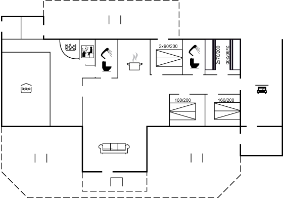 Sommerhus med poolafdeling, der er indrettet med swimmingpool (20 m2) med svømmetræner, 2-personers spabad samt sauna.