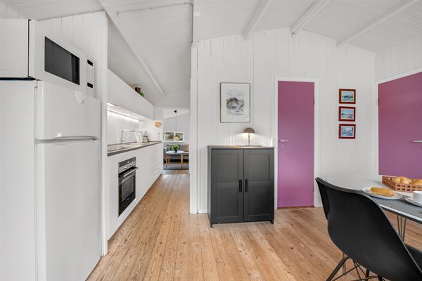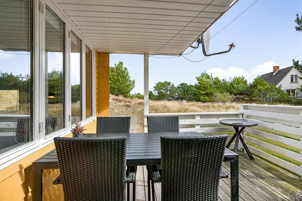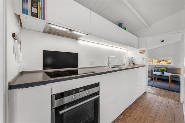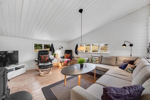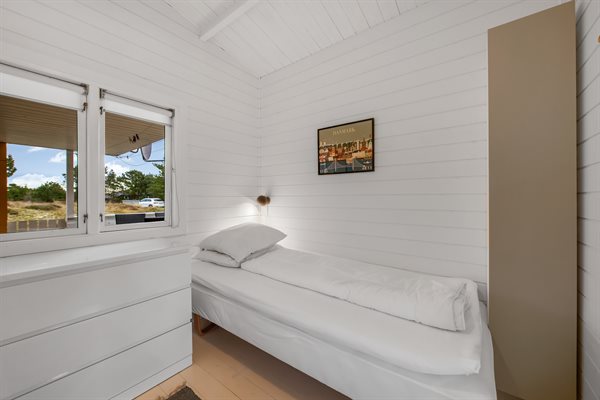 Et enkelt, men hyggeligt indrettet feriehus på dejlig grund omkranset af fyrretræer. Til huset hører 2 terrasser; 1 lukket og delvist overdækket terrasse samt 1 delvist afskærmet terrasse. Køkkenet er kombineret med spiseafdelingen og efter et dejligt måltid kan der hygges med en lille snak over opvasken, da der ikke findes opvaskemaskine i huset. Badeværelset er pænt, men af ældre dato.