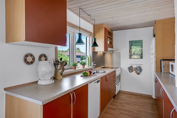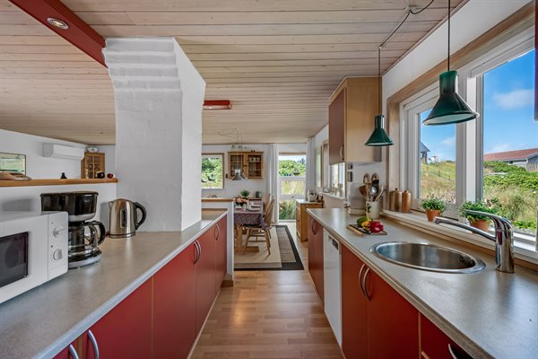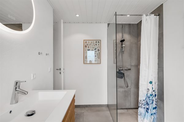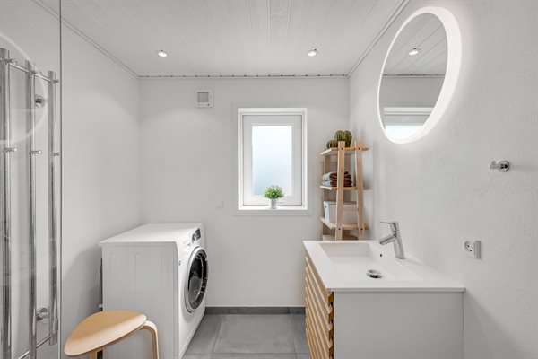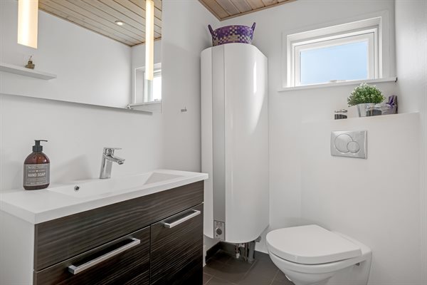 Nyt badeværelse (2024) og et separat toilet til rådighed. Ferieboligen opvarmes primært ved hjælp af en varmepumpe. Ferieboligen er udstyret med en vaskemaskine og tørretumbler. I skur findes der weber-grill, en cykel, parasoller og flere havestole.