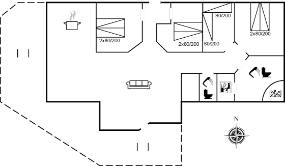 Efter en aktiv dag ved stranden eller en lang gåtur kan man slappe af i husets spabad og i saunaen. Det veludstyrede køkken med kogeø ligger i åben forbindelse med den pæne stue, hvor man kan hygge foran brændeovnen.