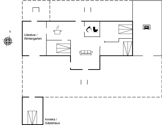 Sommerhus med spændende indretning og god plads til 6 personer. Huset er indrettet med åbent køkken og stue samt det ene værelse kan lukkes op, så det også indgår som en del af alrummet. Til huset er der endvidere et anneks med 2 sovepladser.