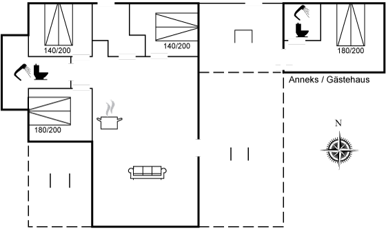 Der er fire soveværelser med i alt otte sovepladser i dobbeltsenge, hvoraf to befinder sig i et anneks med tilhørende bad og toilet – perfekt til teenagere eller par, der ønsker lidt ekstra privatliv.