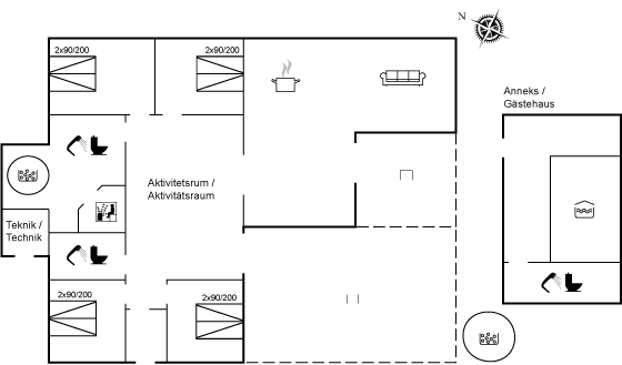 Derudover kan I nyde både indendørs spa og sauna samt slappe af i den udendørs spa under åben himmel. For de aktive gæster byder huset også på et aktivitetsrum med mulighed for sjov og samvær.