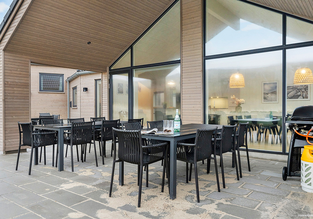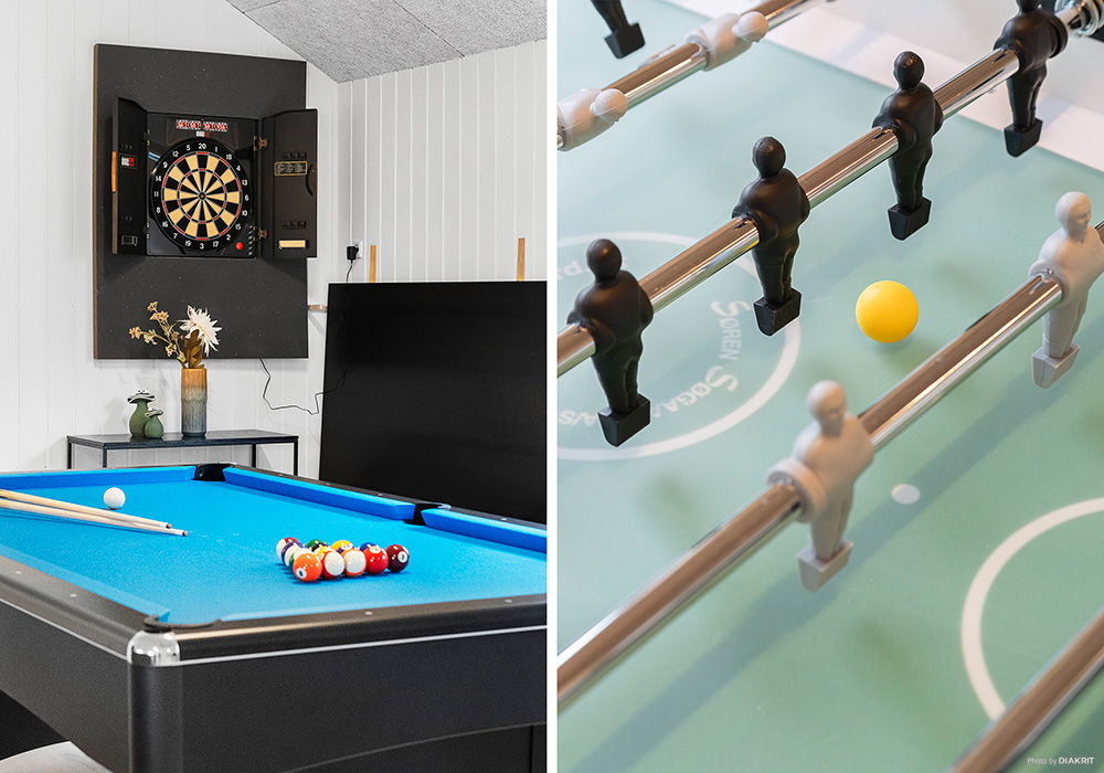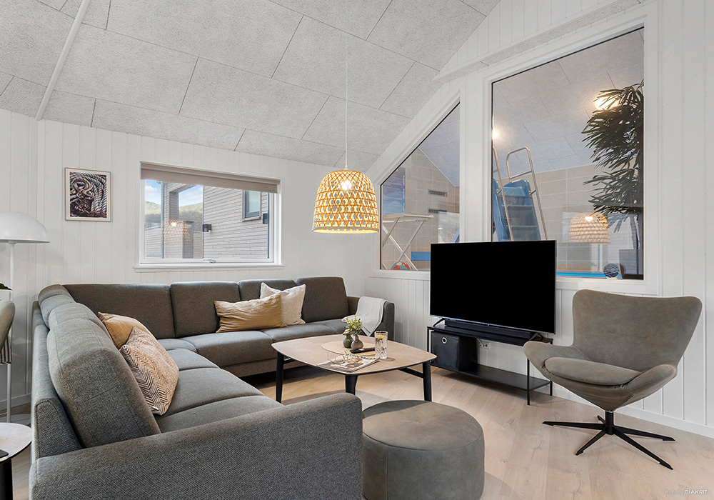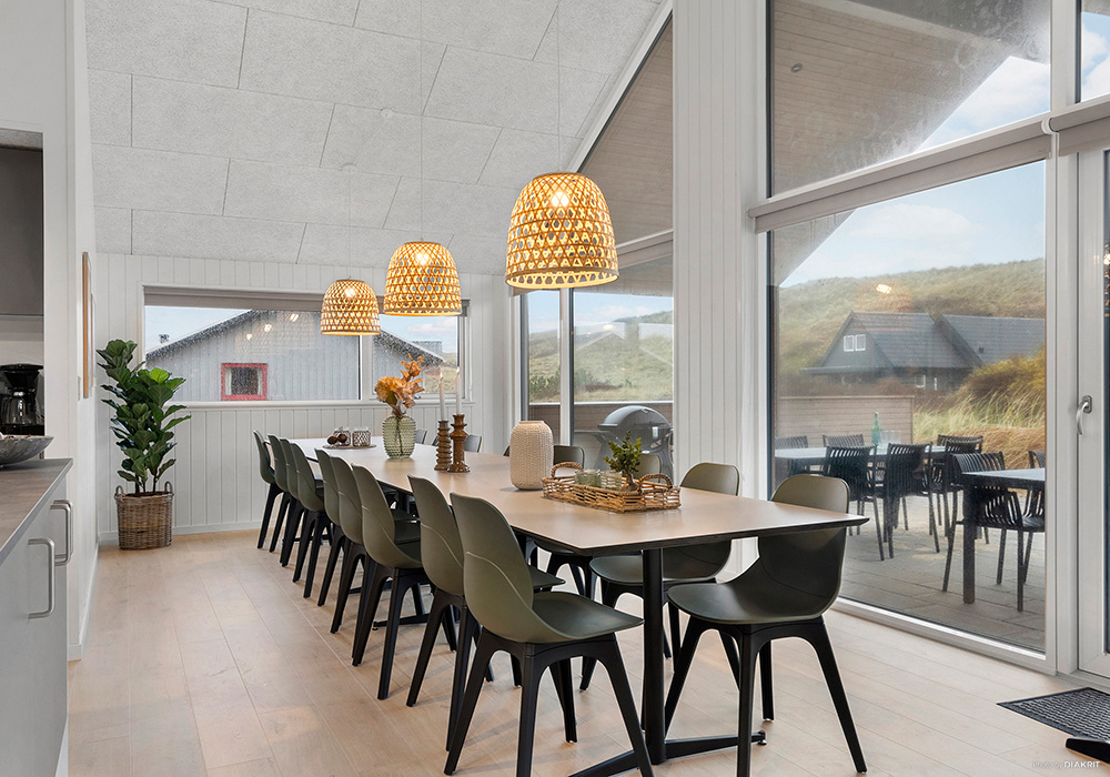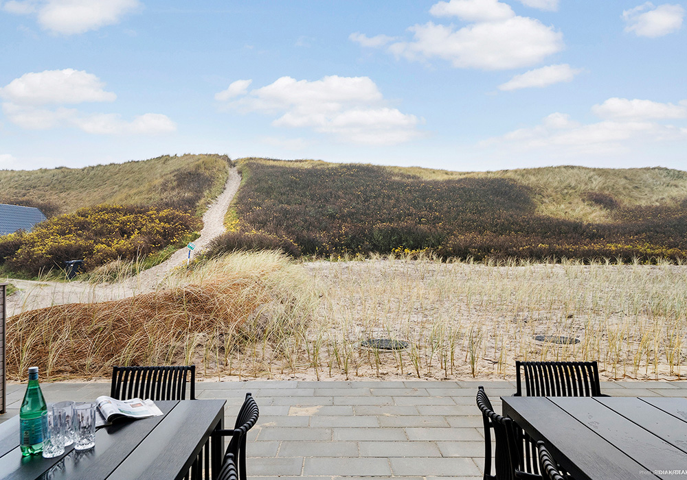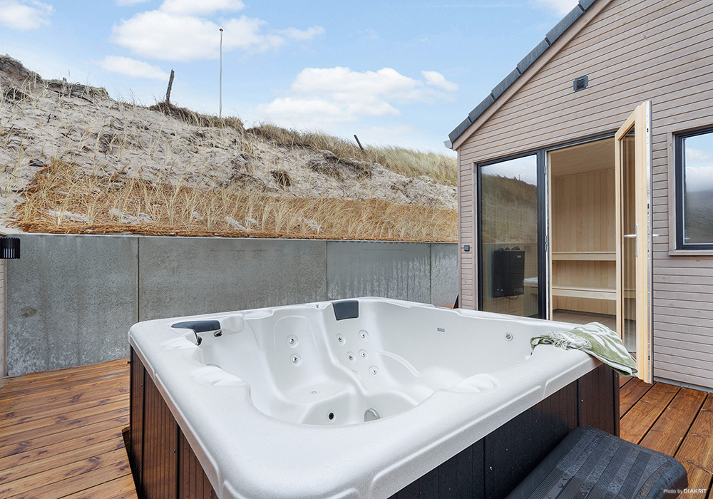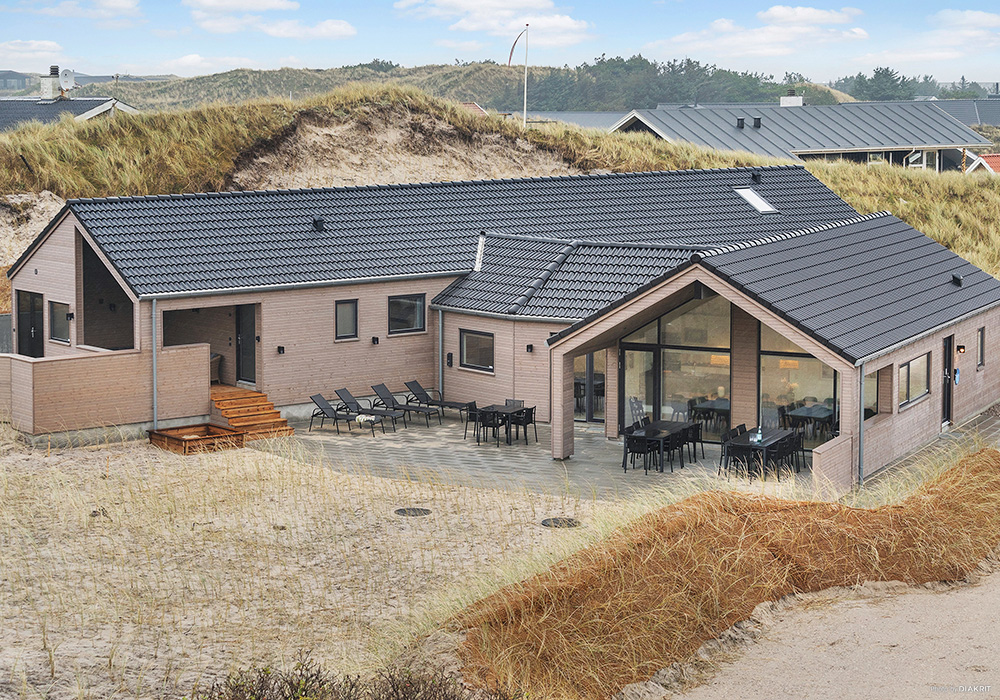 Dette unikke poolsommerhus ved Hvide Sande ligger kun 50 meter fra stranden og kombinerer luksus, natur og fællesskab. Med plads til op til 18 personer fordelt på syv soveværelser, fire hemsepladser og tre badeværelser er huset ideelt til store familier og vennegrupper. Det rummelige opholdsrum og XL-køkken indbyder til samvær og fælles madlavning, mens aktivitetsrummet tilbyder spil, dart, bar og afslapning. I husets hjerte finder I en dejlig poolafdeling med rutsjebane \u2013 perfekt til både leg og hygge. Udendørs kan I nyde terrassen, grillmiddage, spa og sauna efter en dag ved havet. Et ægte Sammenhus\u2122 til mindeværdige ferier ved Vesterhavet.