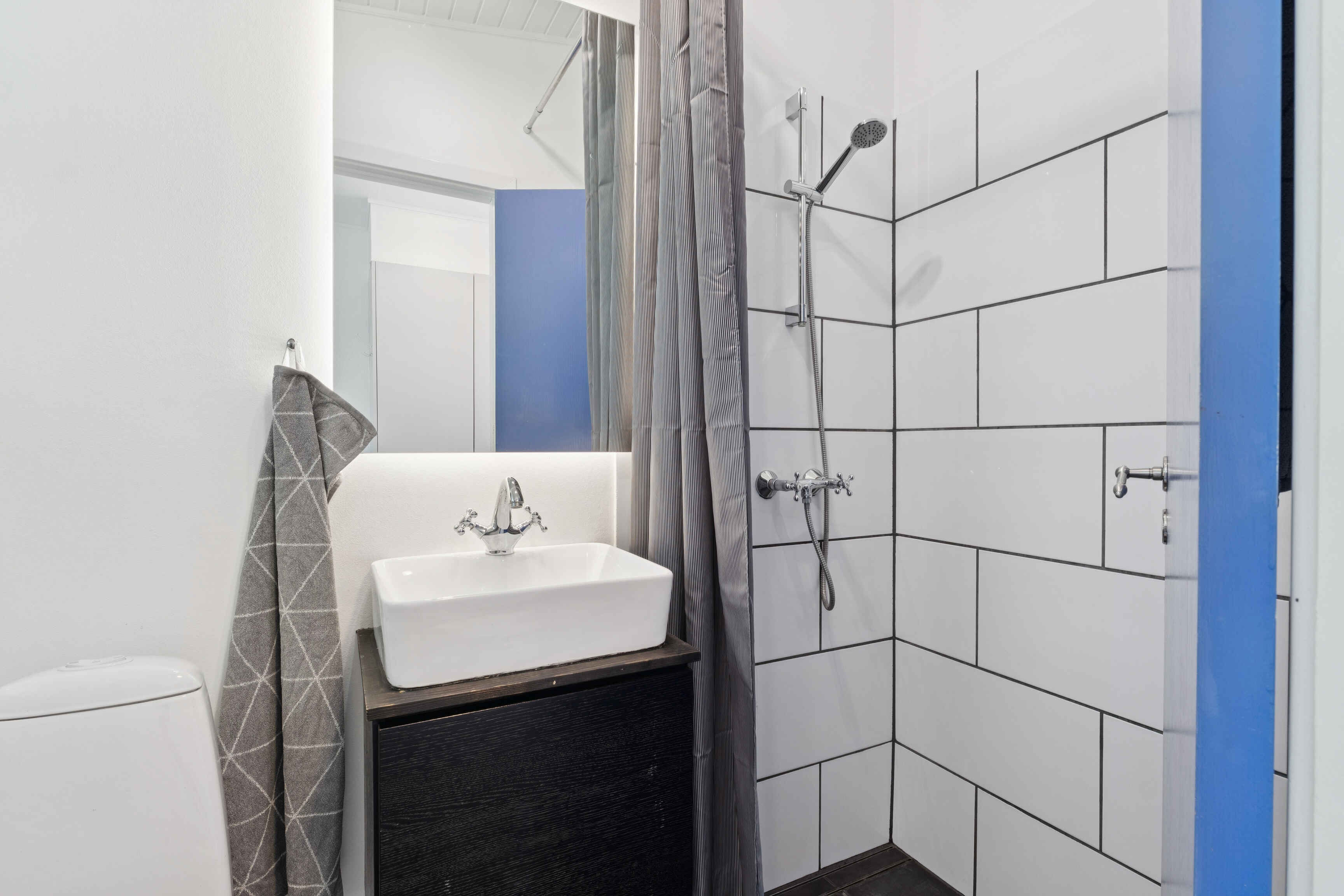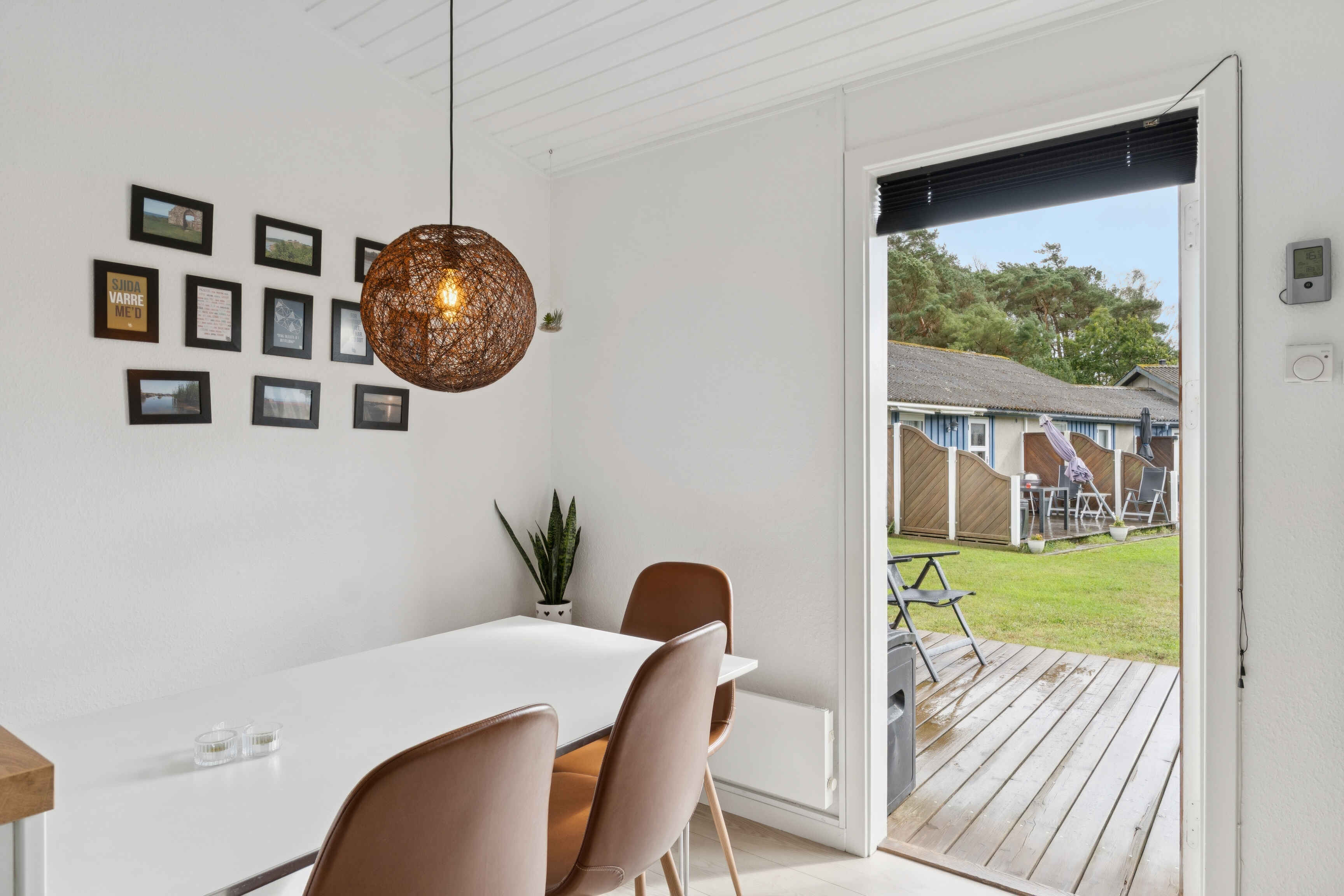 Boligen er 42 m² og har plads til fire personer. Den rummer et soveværelse med dobbeltseng samt en dobbeltopredning i alkoven i stuen. Indretningen er lys og moderne, og stuen har direkte udgang til en møbleret terrasse med grill.