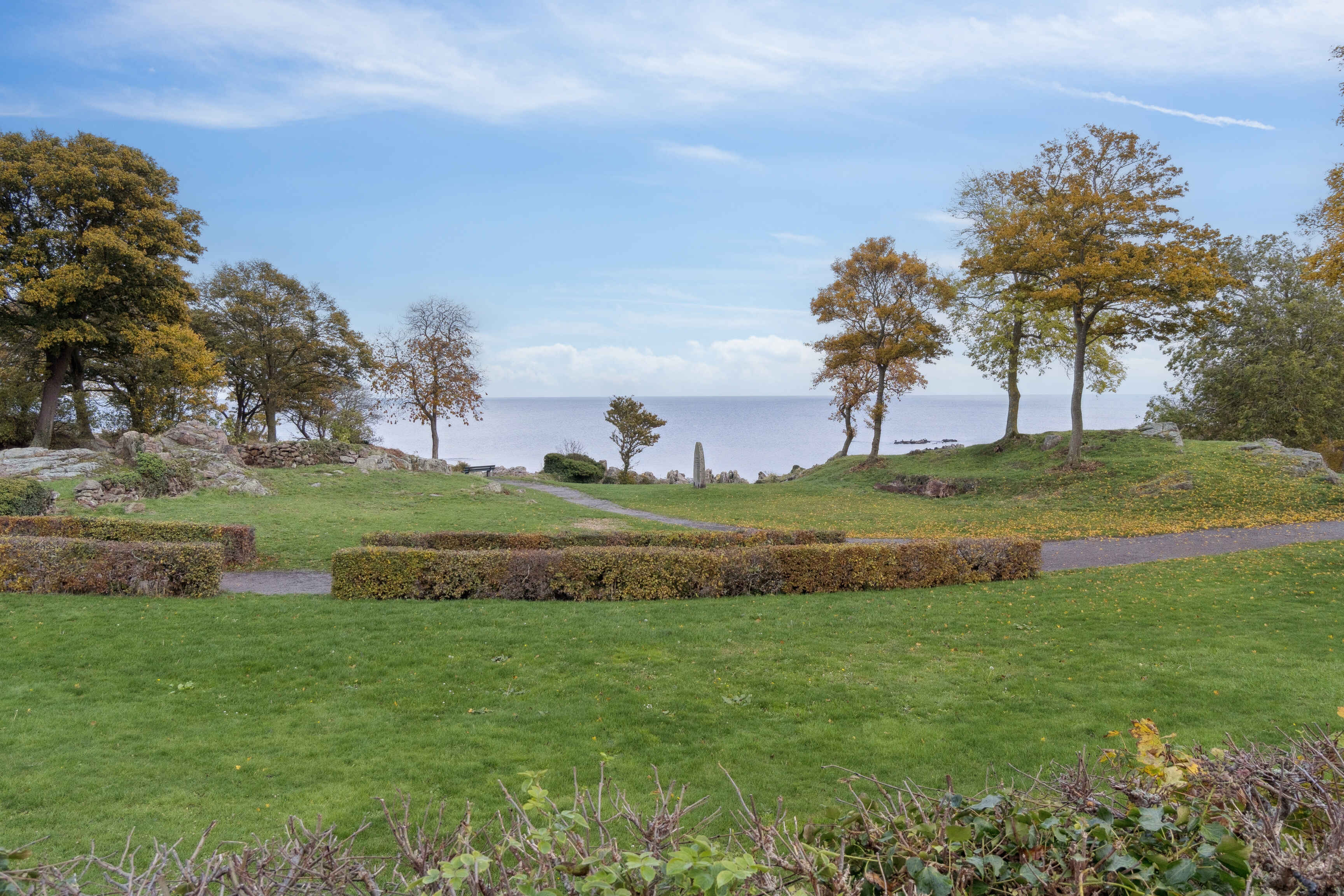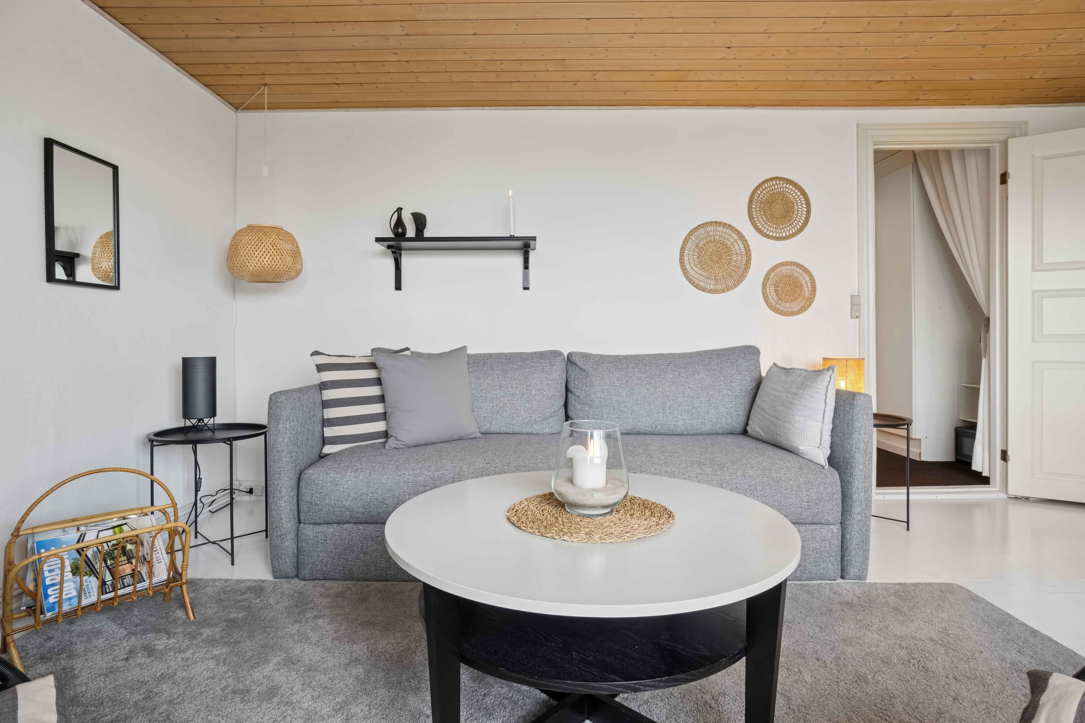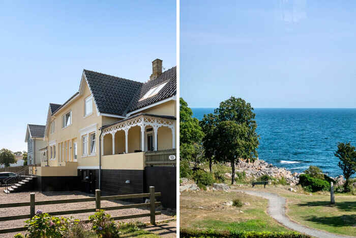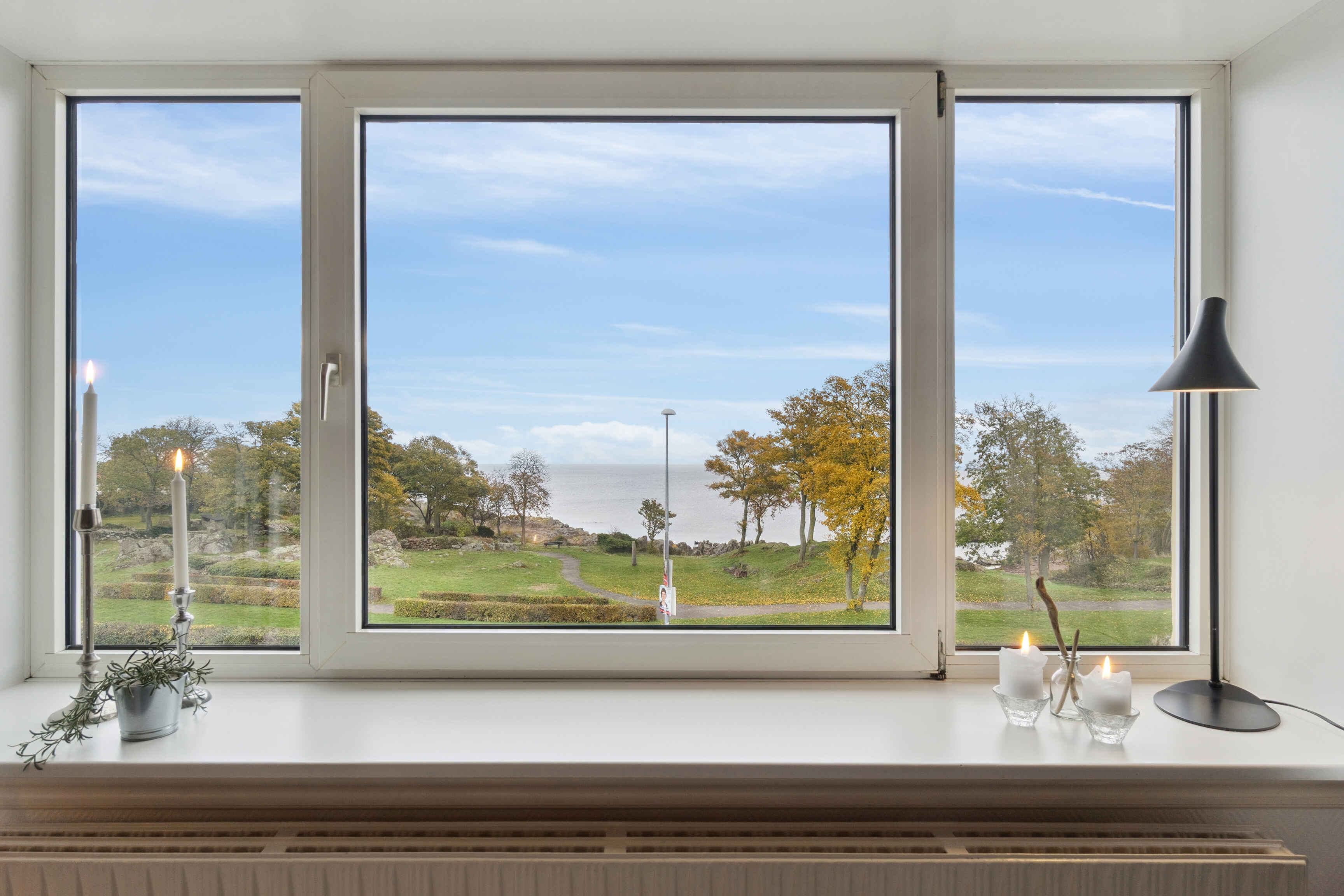 Fra stuen åbner udsigten sig mod parkanlægget ved Domen, hvor dagens rytme let følger lyset over havet. Afstanden til vandet er blot 150 meter, hvilket giver oplagte muligheder for en morgendukkert eller en stille aftentur langs kysten.