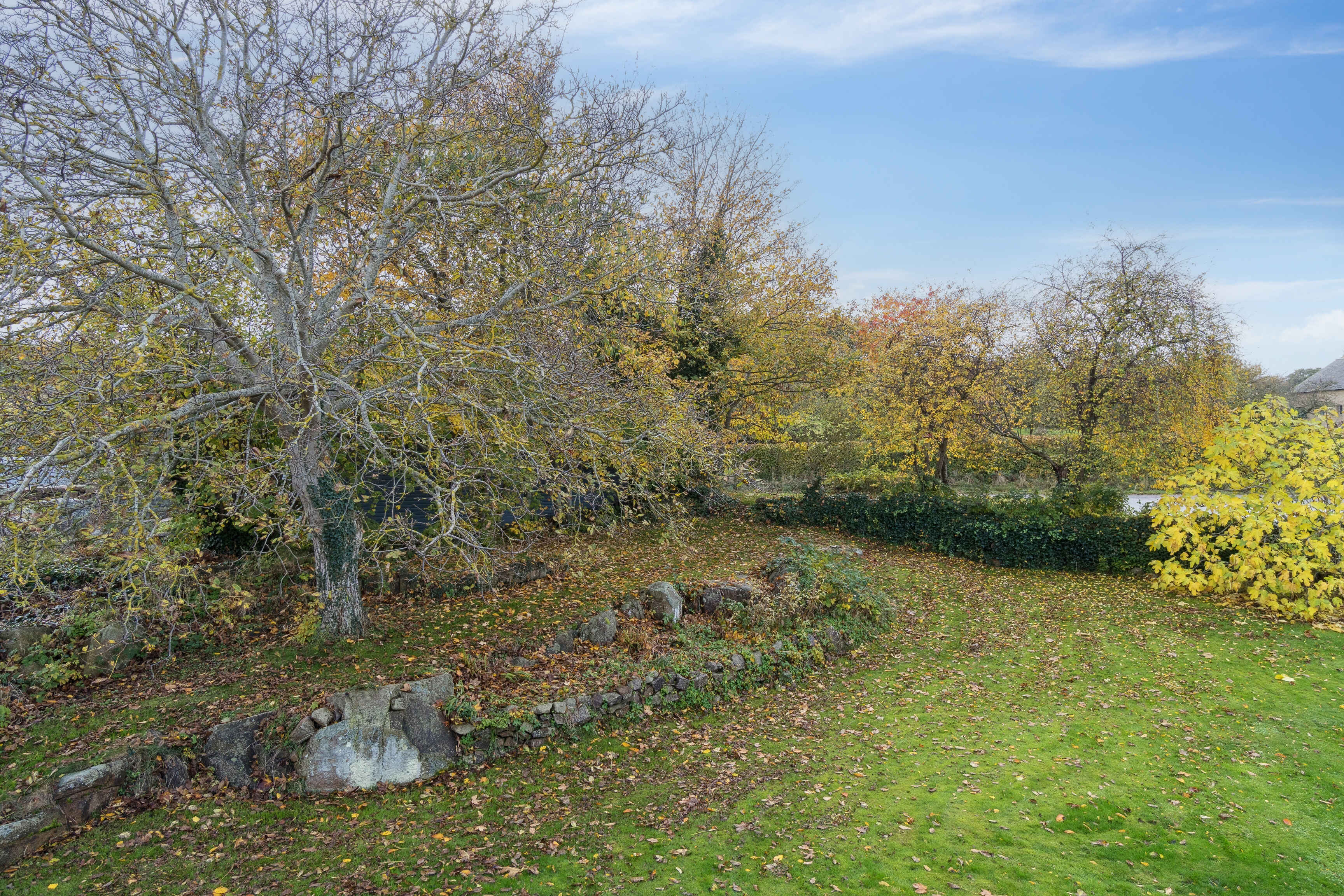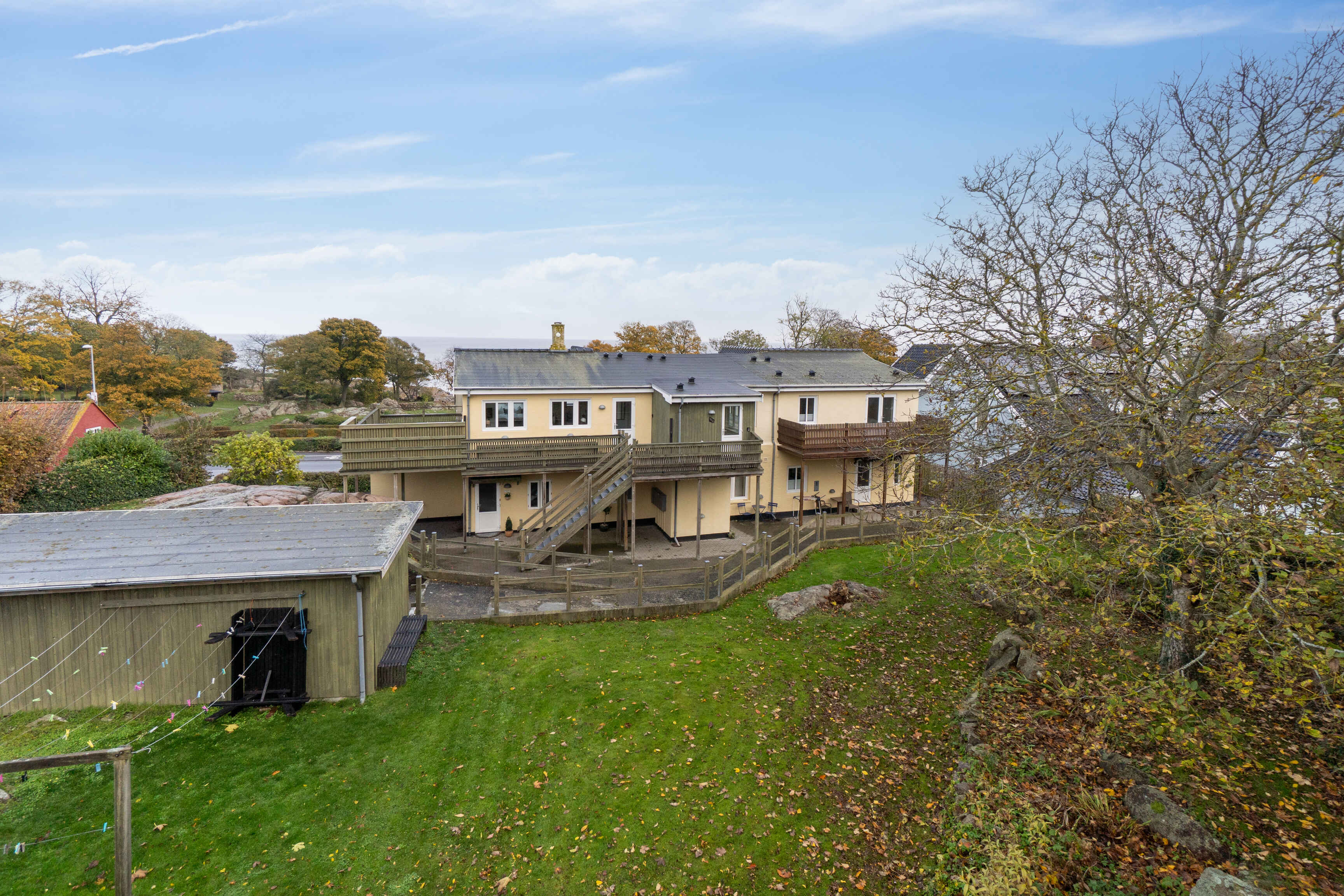 Ejendommen har en charmerende havegrund med klipper, kroge og solpladser, der gør det nemt at finde et roligt hjørne til kaffe eller grill. Parkering findes lige ved bagvejen, så ankomsten er ukompliceret.