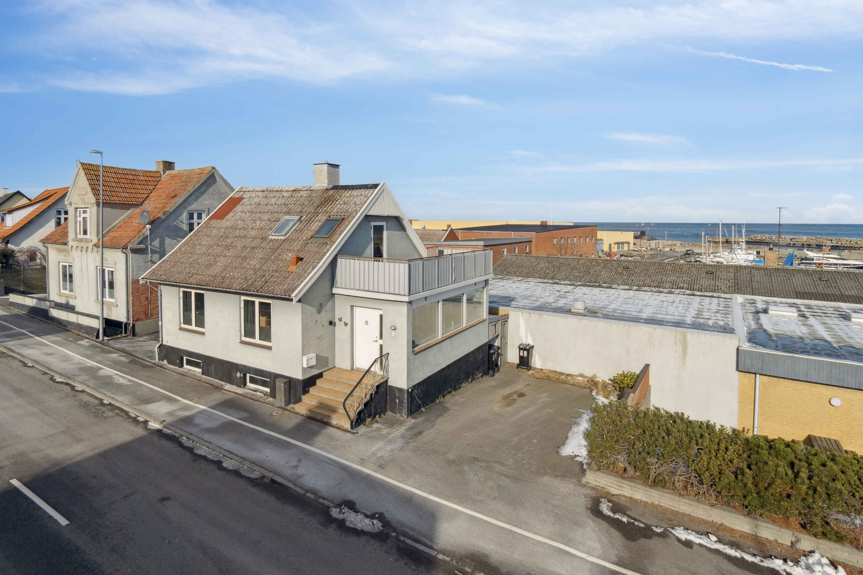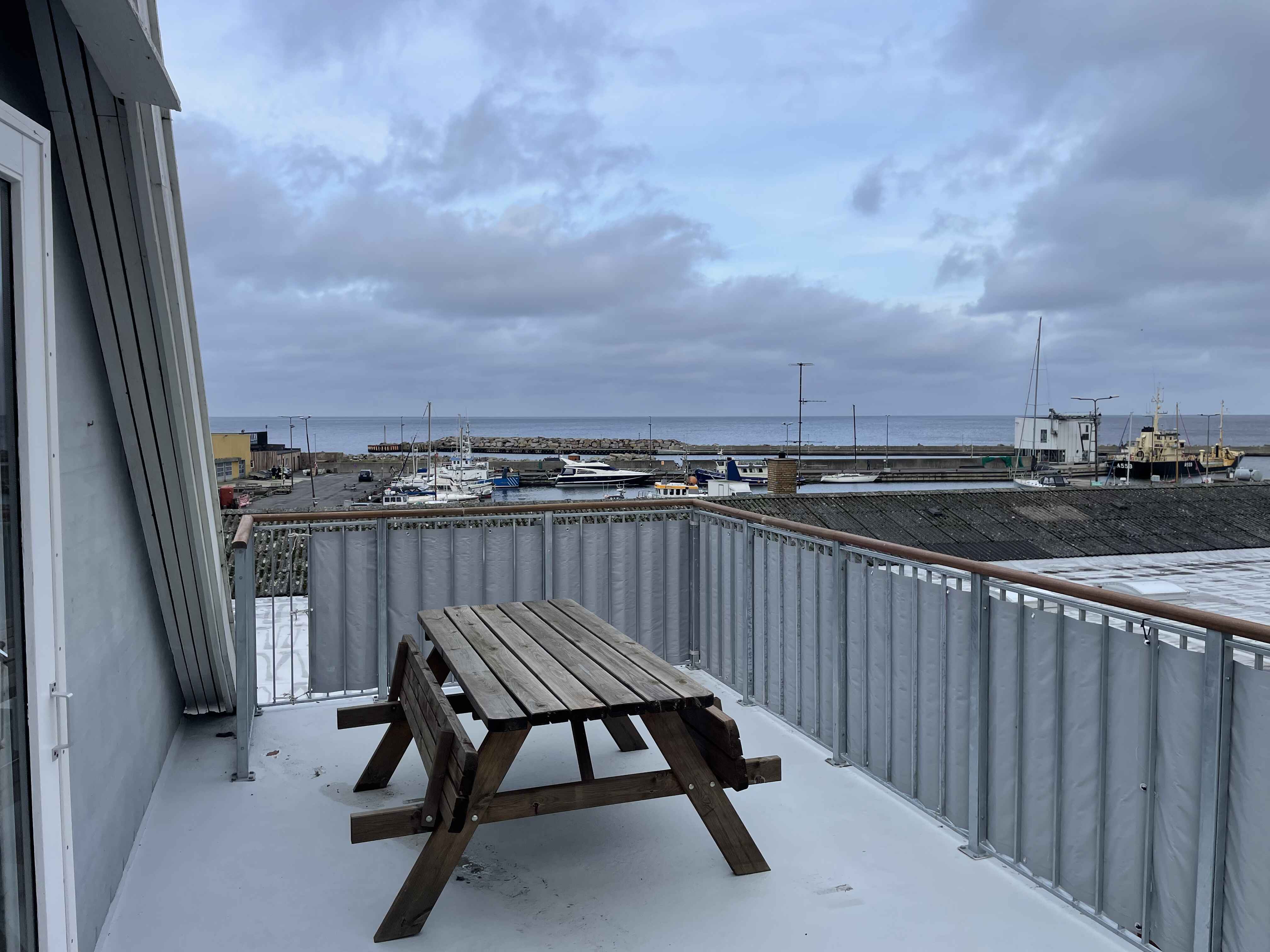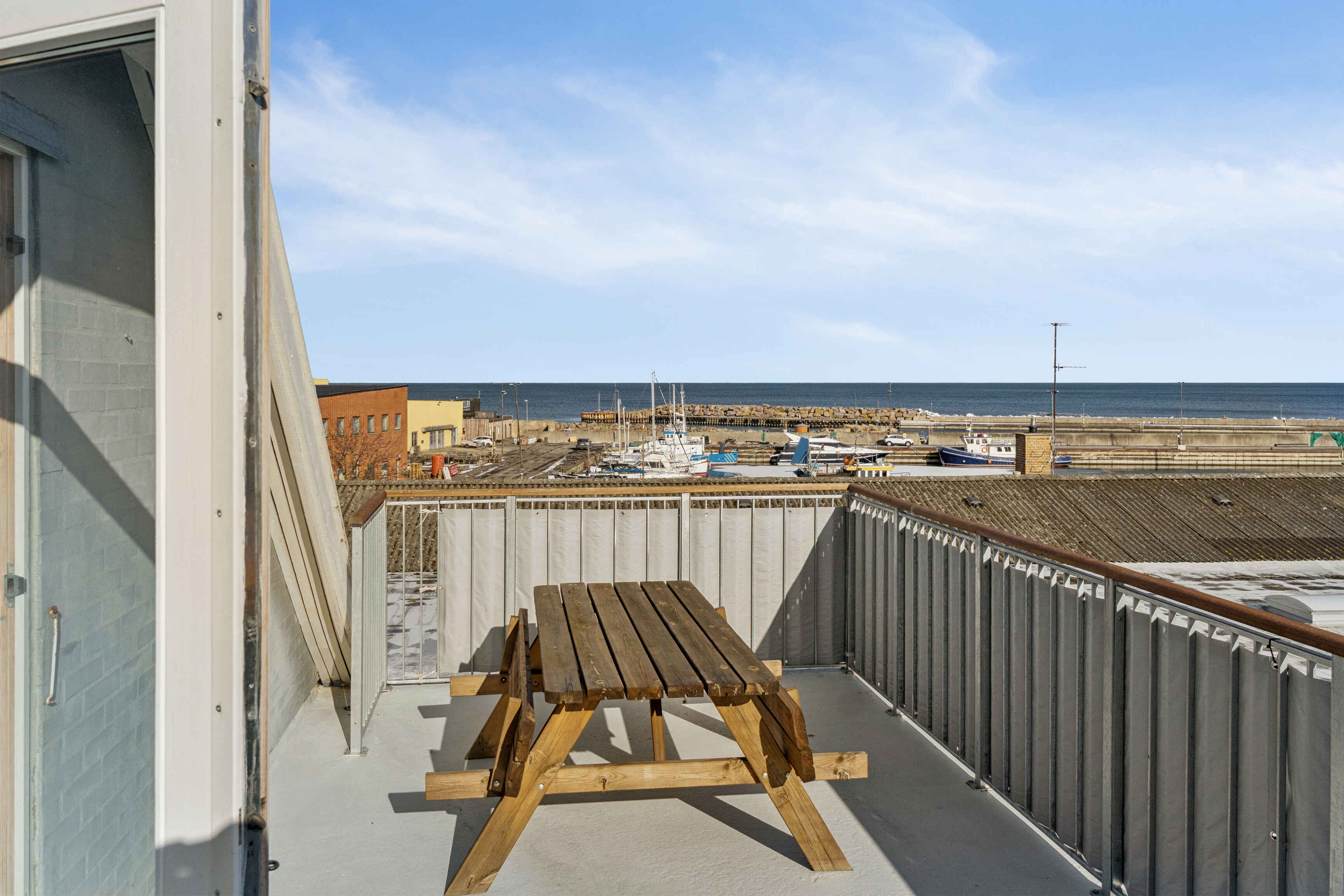På første sal ligger et soveværelse, et mindre kammer og badeværelse. Herfra er der udgang til en veranda med udsigt over havnen og Østersøen.