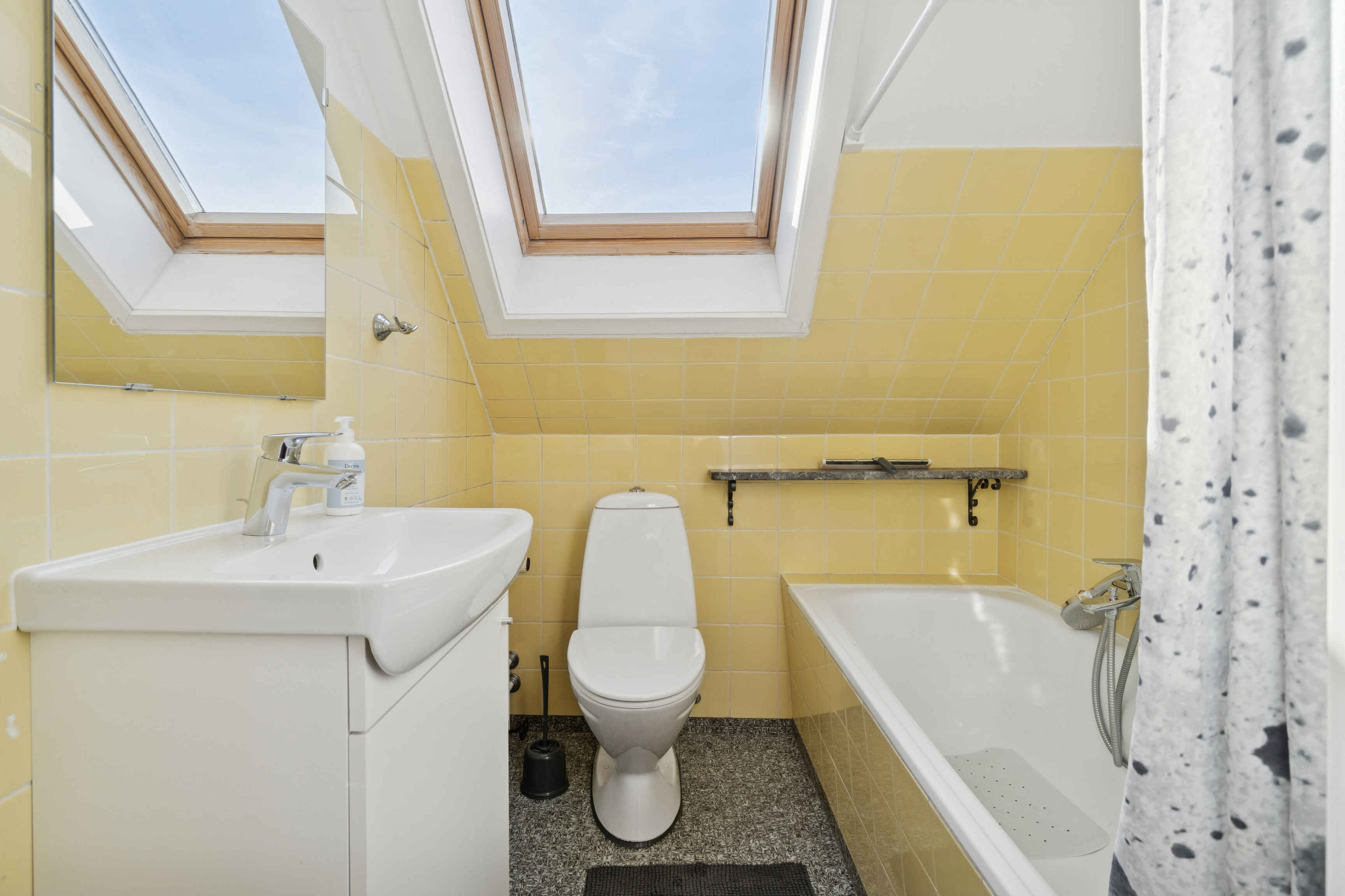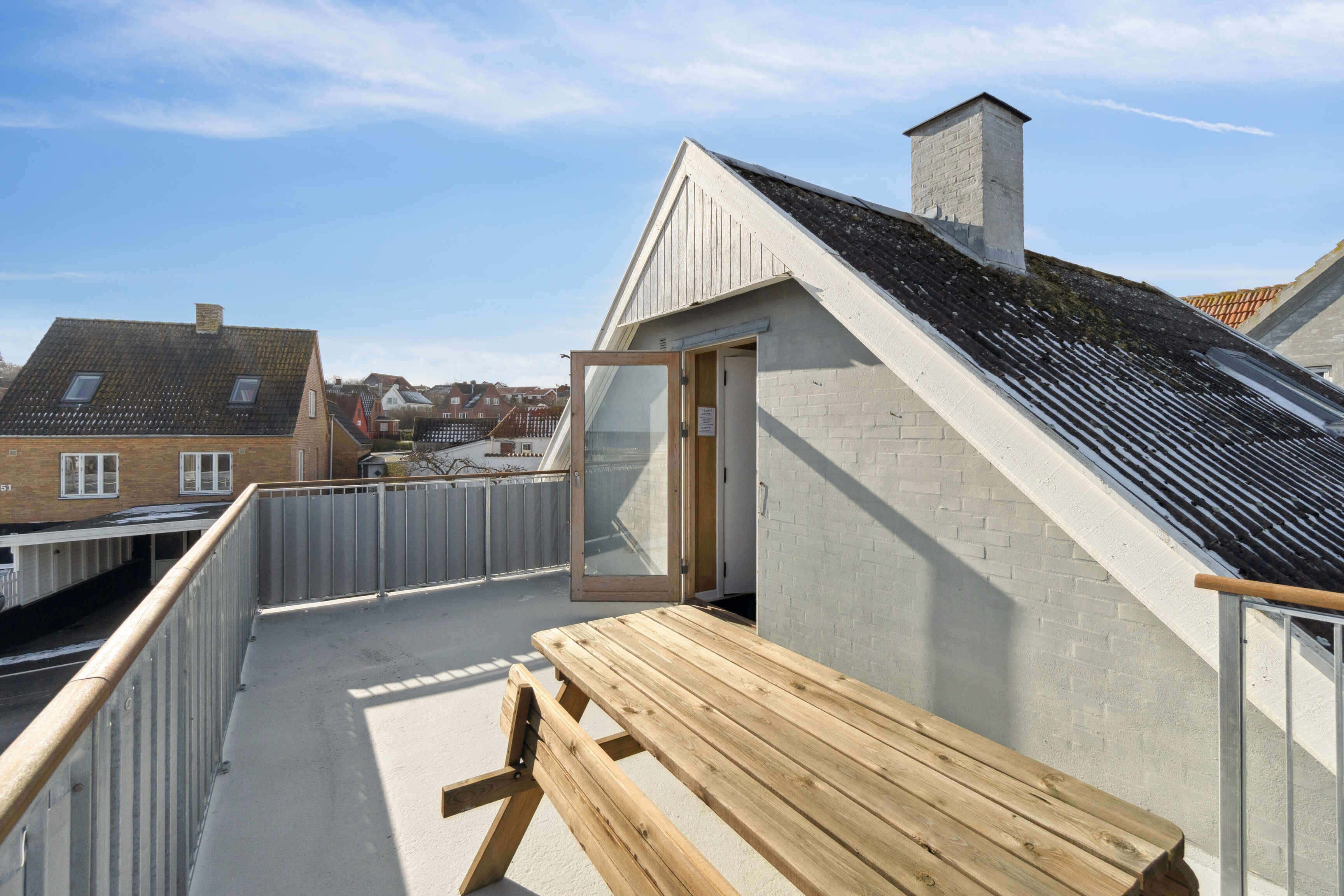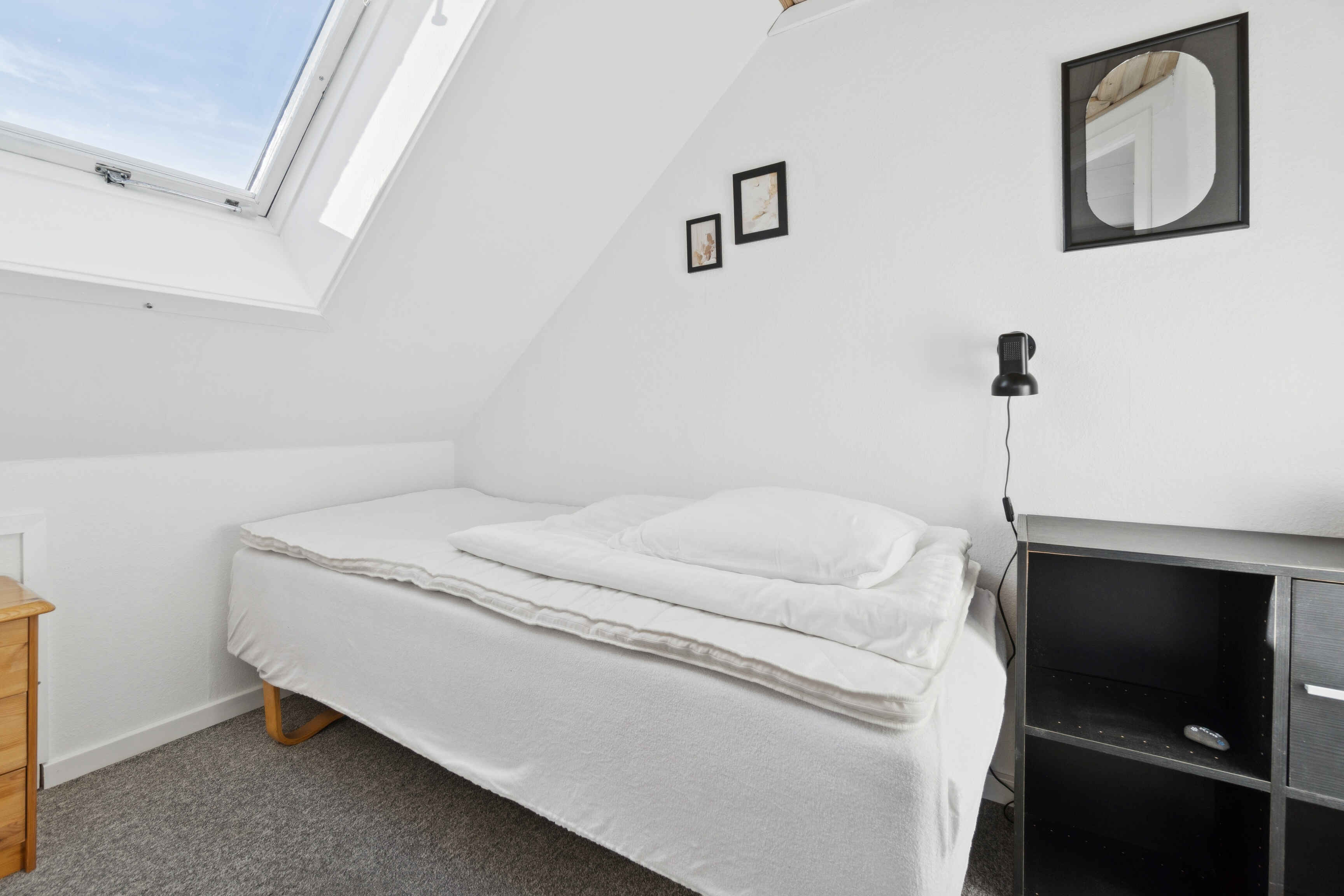 På første sal ligger et soveværelse, et mindre kammer og badeværelse. Herfra er der udgang til en veranda med udsigt over havnen og Østersøen.