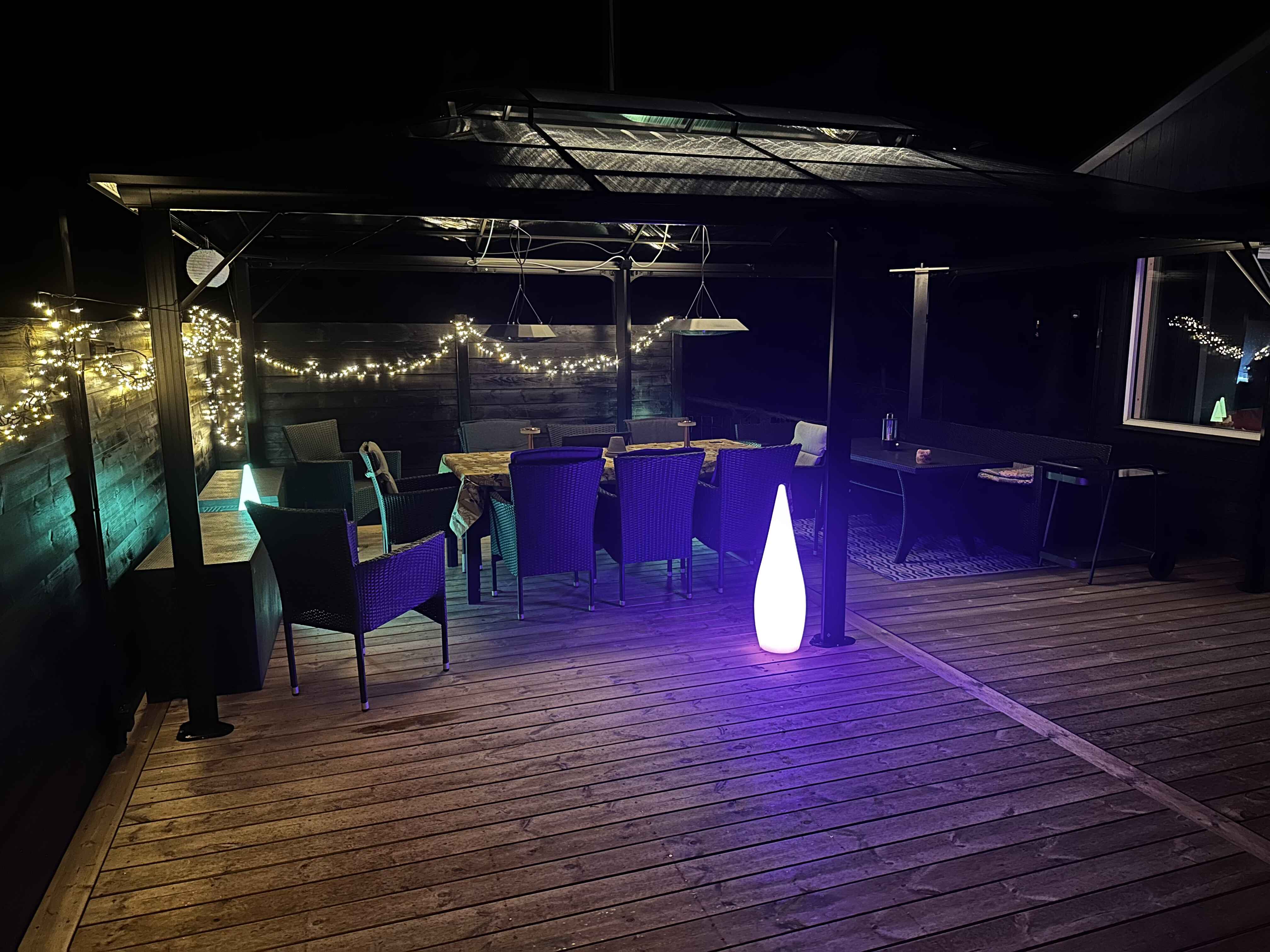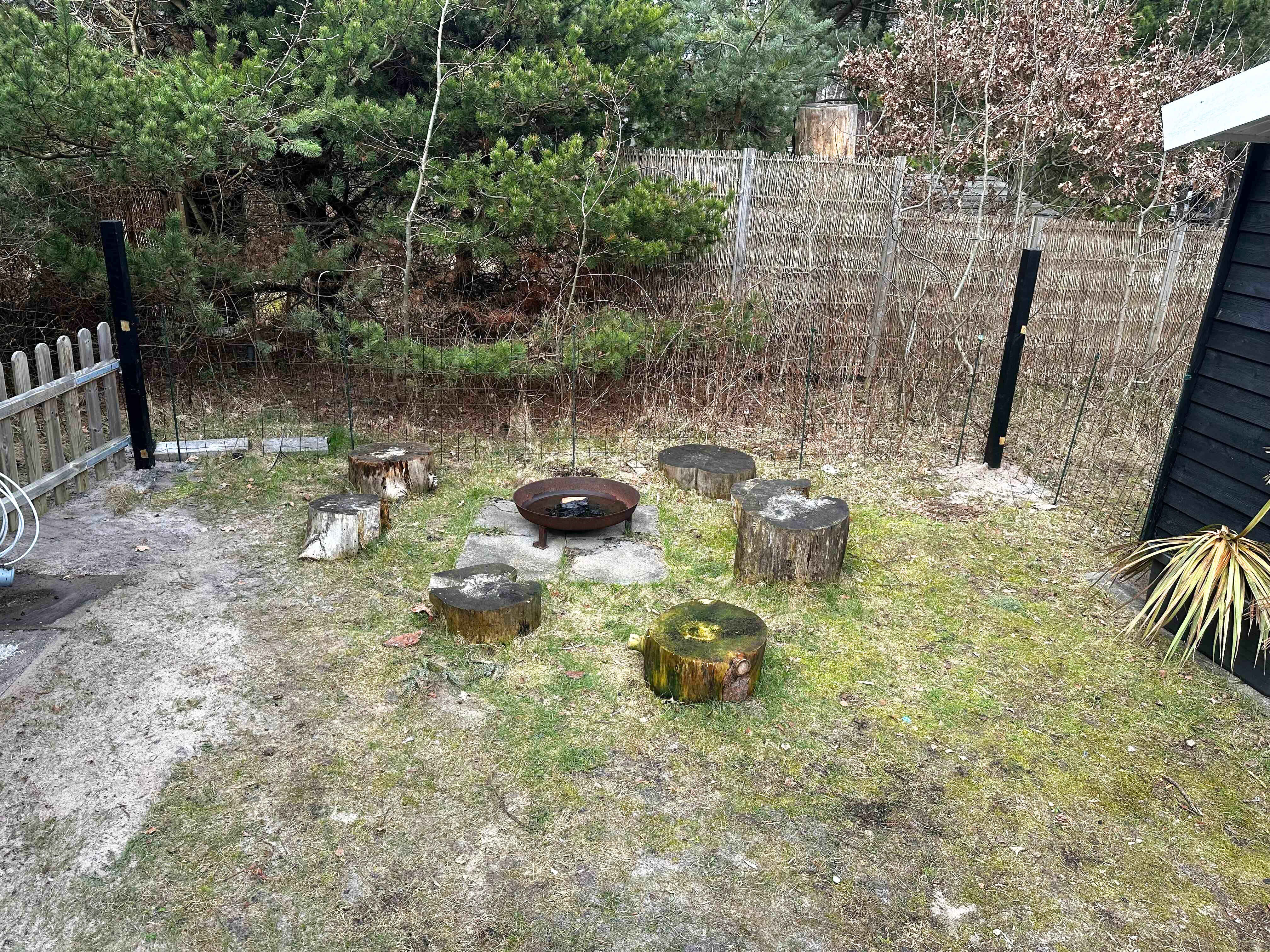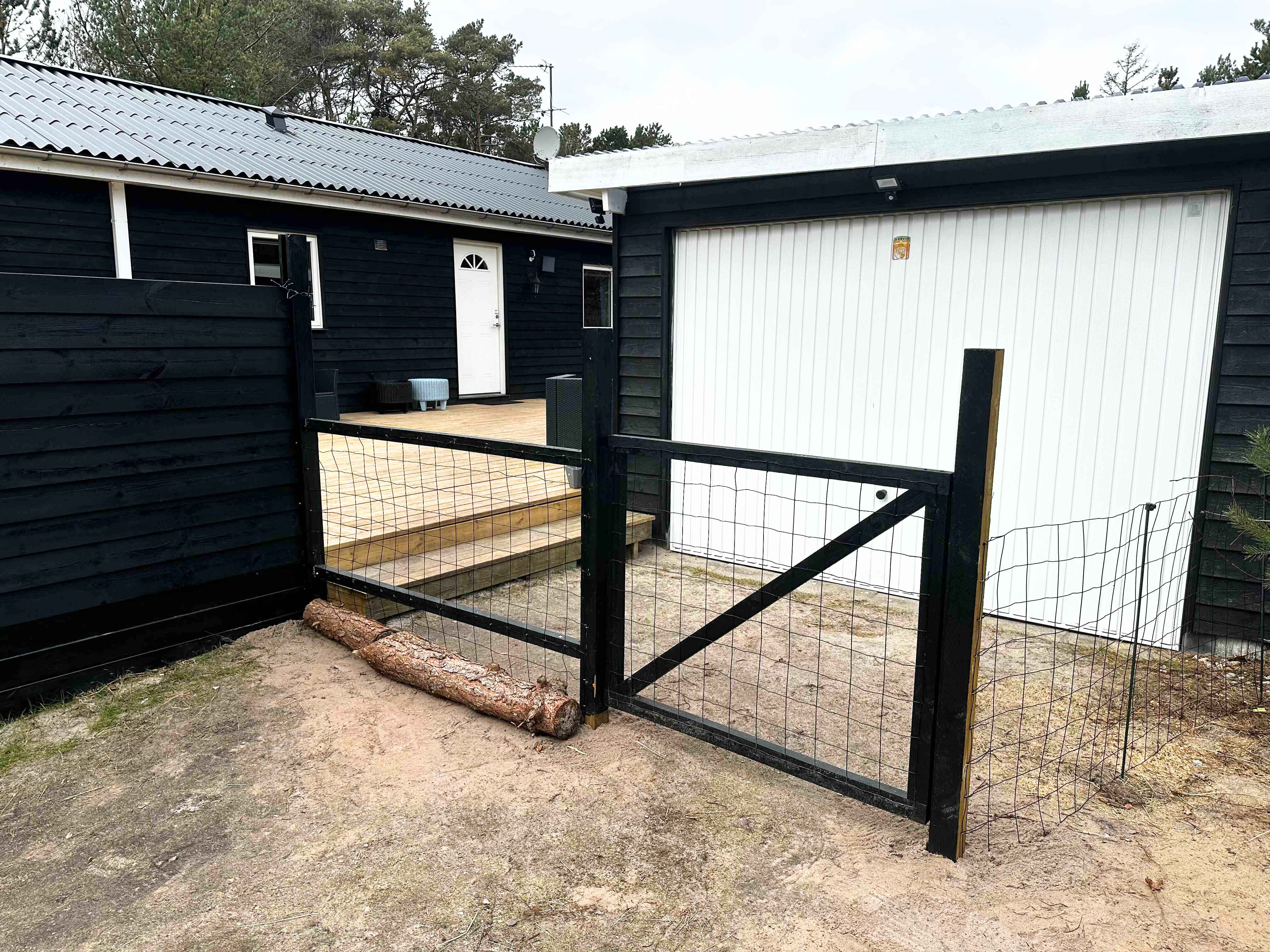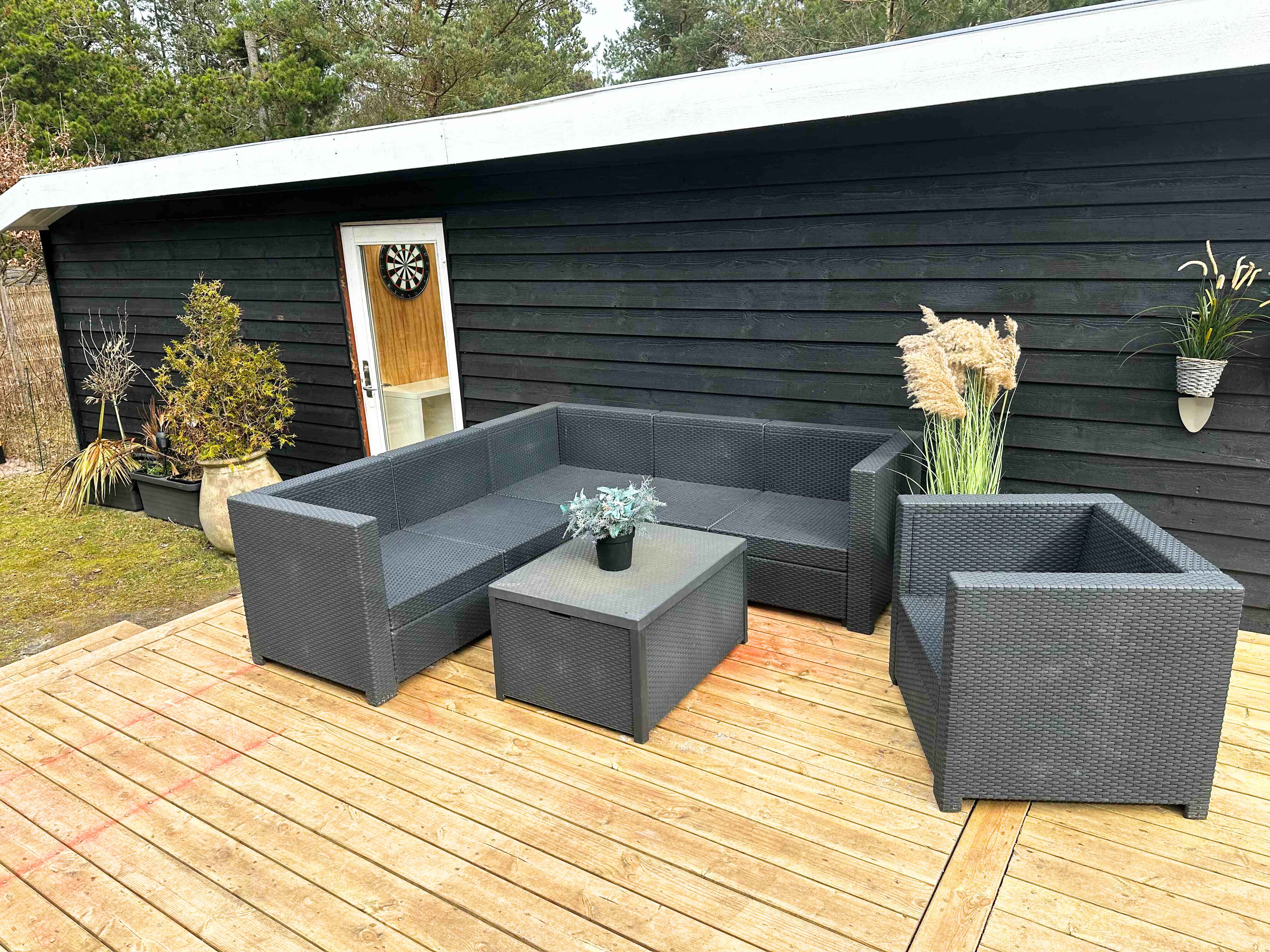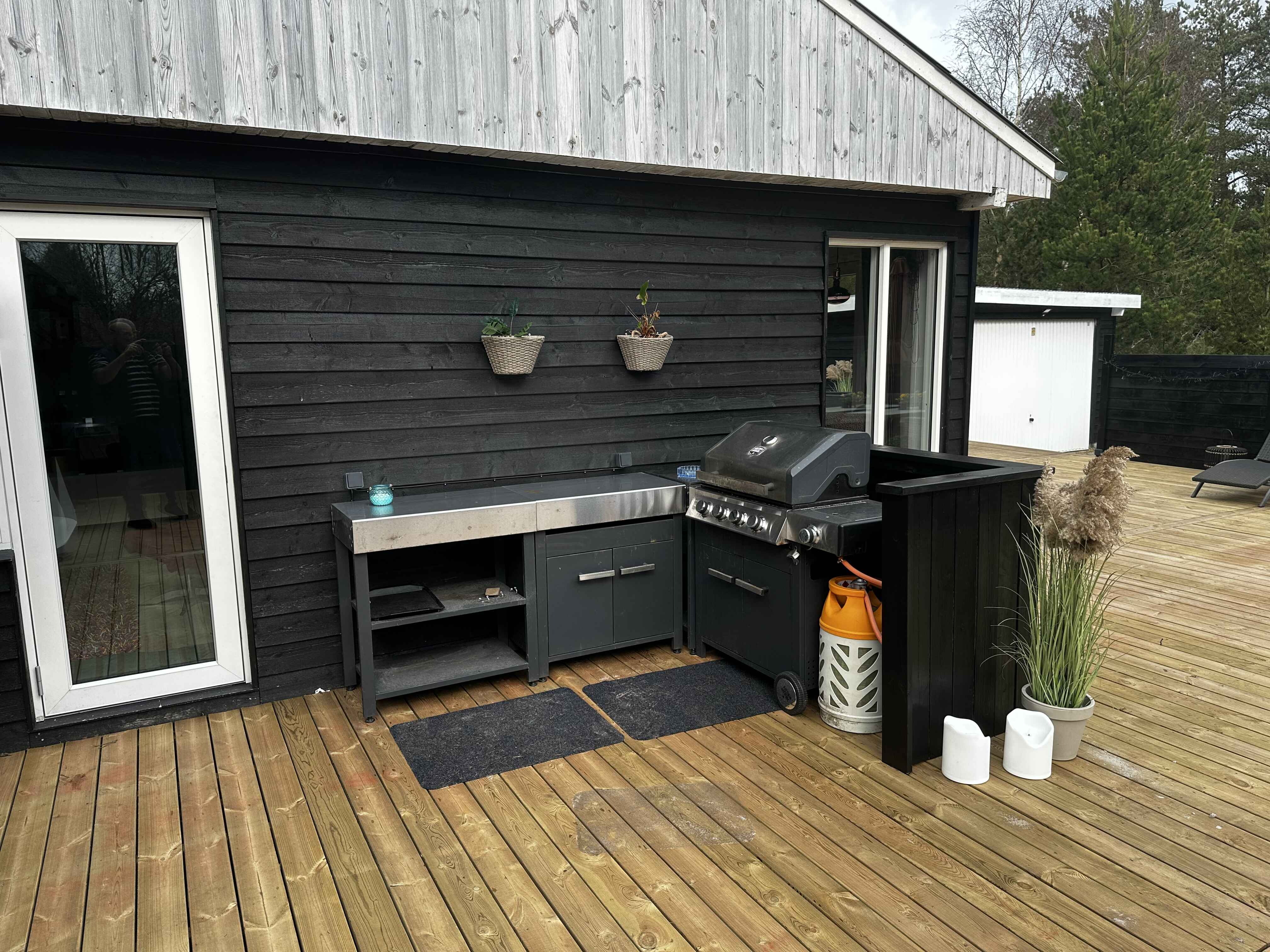Ude på den 1.493 m2 store grund naturgrund er der også godt at være – ikke mindst på terrassen, der smyger sig om to sider af som­mer­hu­set. Mod øst er der havkig fra terrassen og mod syd er den er skærmet af et hegn så man kan færdes ugeneret på terrassen. Lig­ge­sto­le, havemøbler og en grill står til rådighed, så I ikke skal mangle noget. Herudover er mulighed for at riste skumfiduser ved bålpladsen. I garagen forefindes forskellige aktiviteter som I kan hygge Jer med.