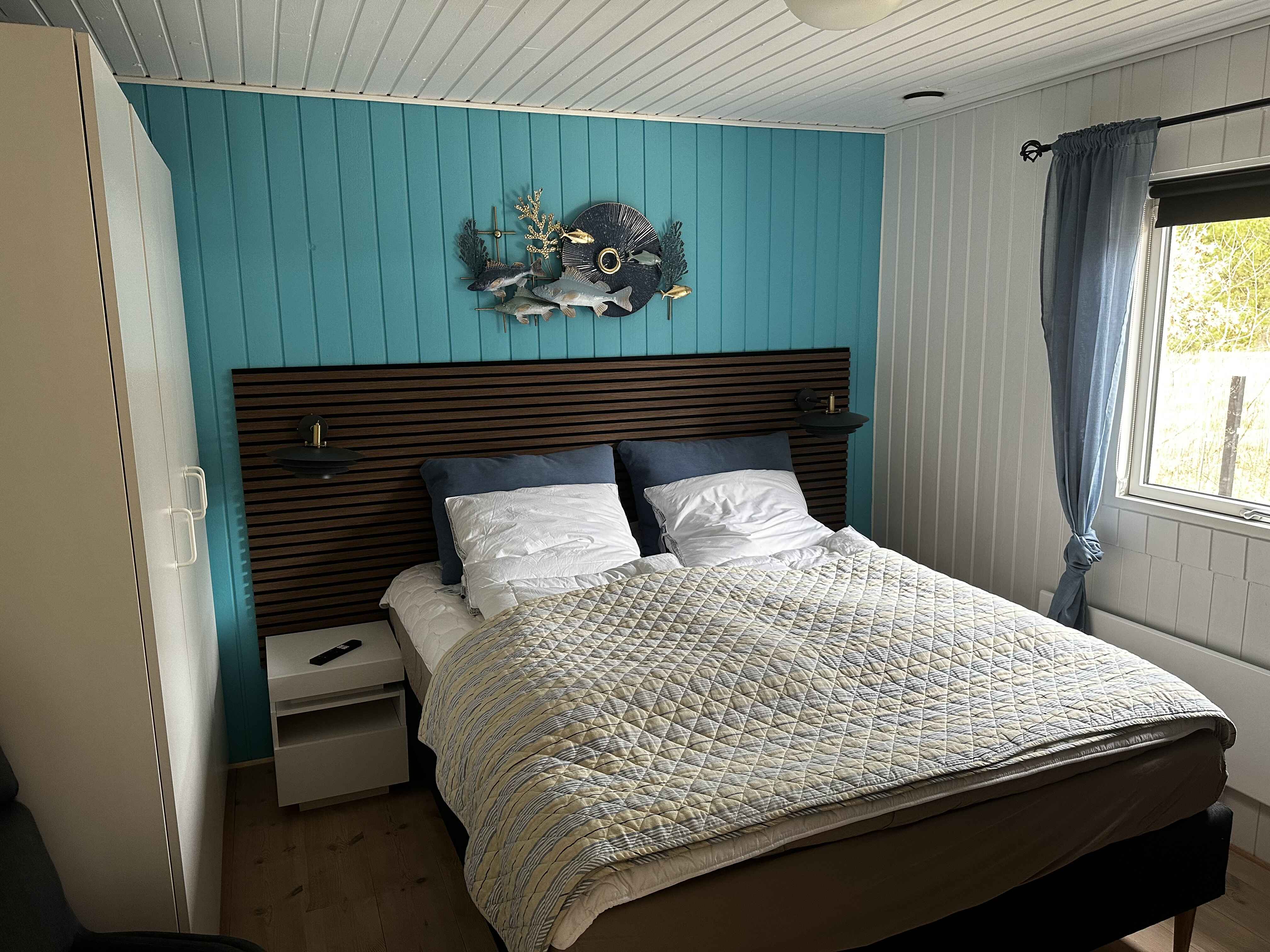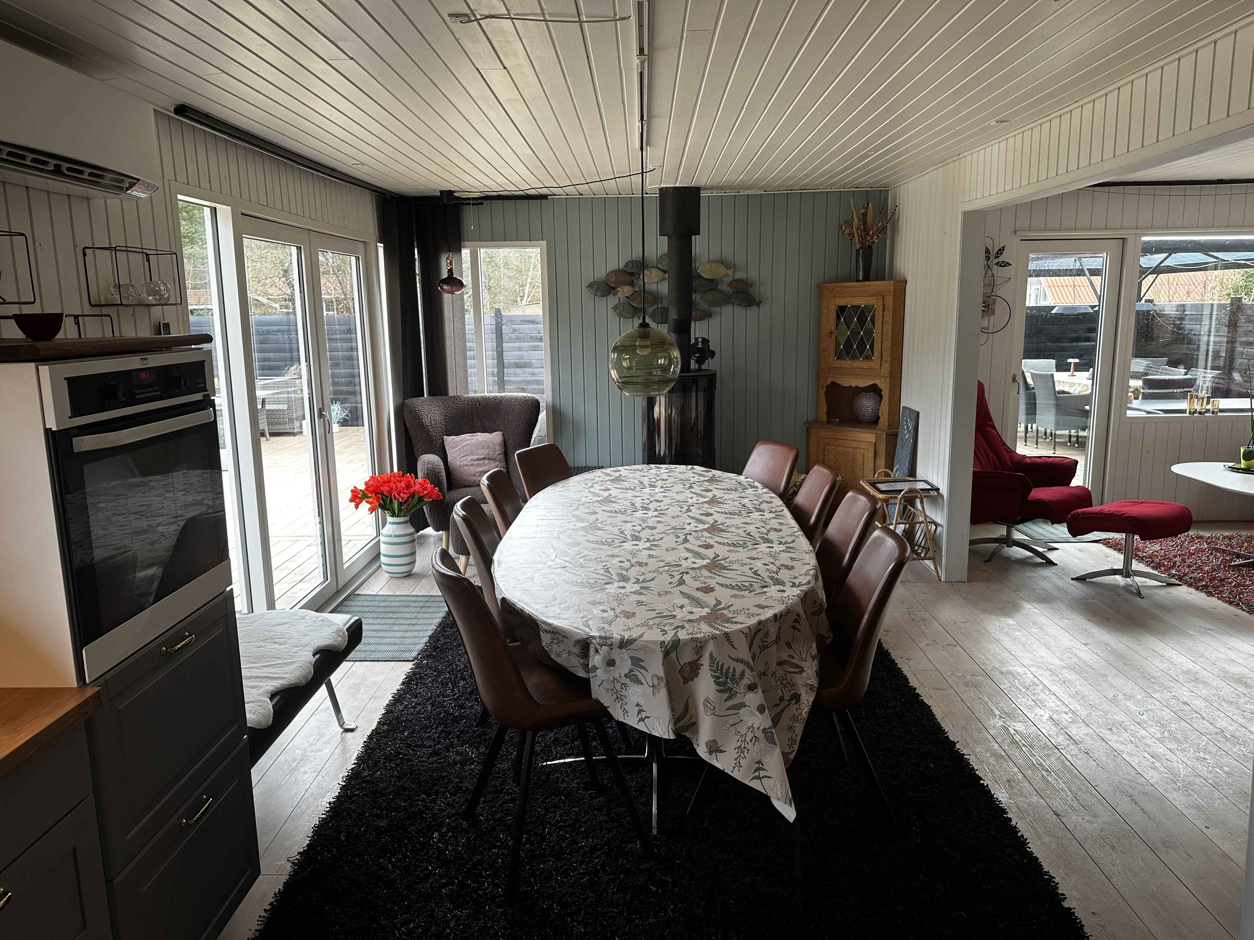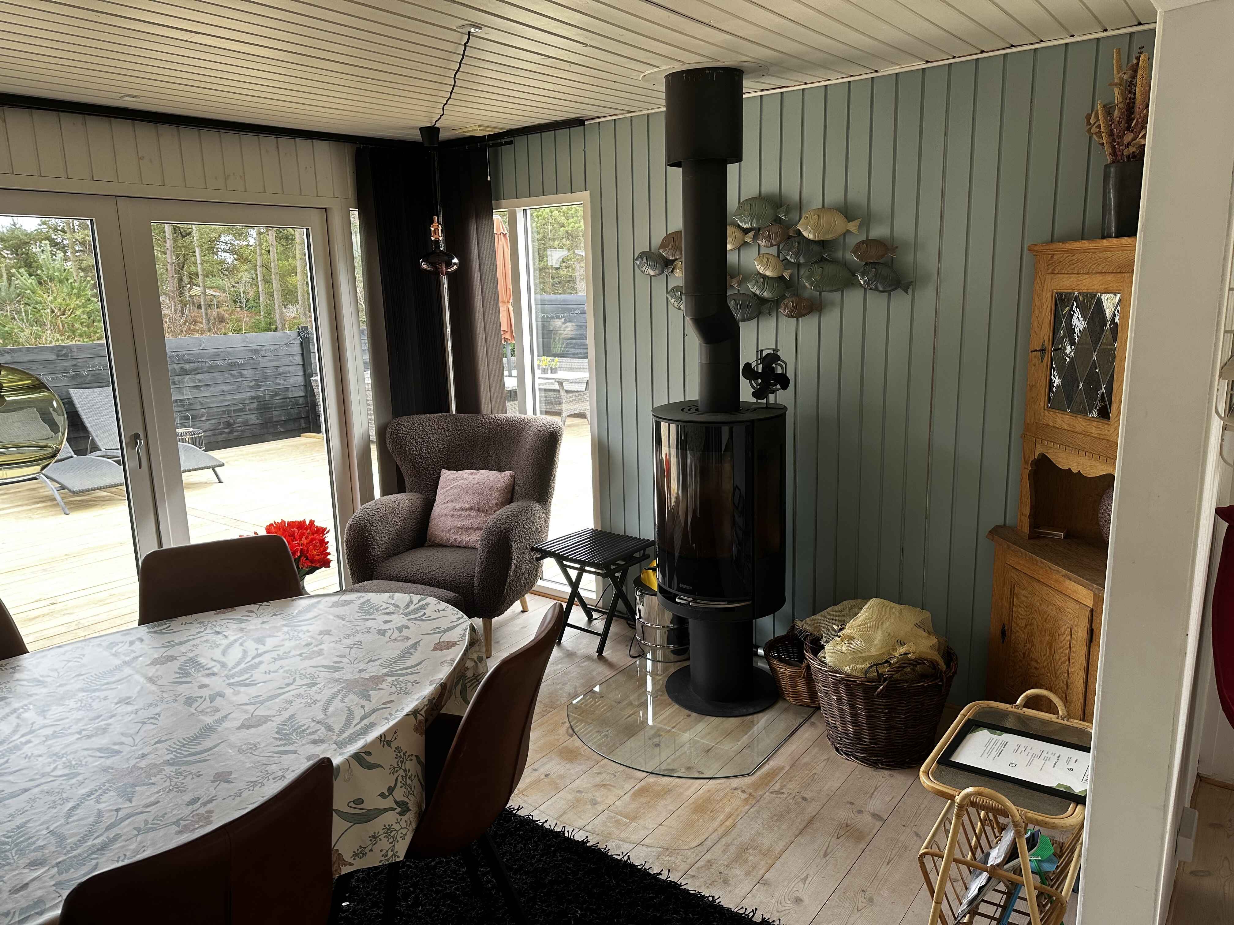 Inden døre er der lyst og ind­by­den­de, og man kan tydeligt mærke, at der er lagt vægt på at gøre rummene hyggelige og stem­nings­ful­de. Det gælder de fire soveværelser, der alle er udstyret med dob­belt­seng. 2 af soveværelserne er udstyret med TV med Chromecast. Stue og køkken ligger i åben for­bin­del­se. Her er der brændeovn og varme pumpe til even­tu­el­le kølige dage og aftener, og hvis I er i humør til en god film eller lidt let un­der­hold­ning, står der et TV med Chro­mecast placeret ved sofa afdelingen. Kort sagt meget be­ha­ge­li­ge rammer, ferie livet kommer til at udspille sig i.