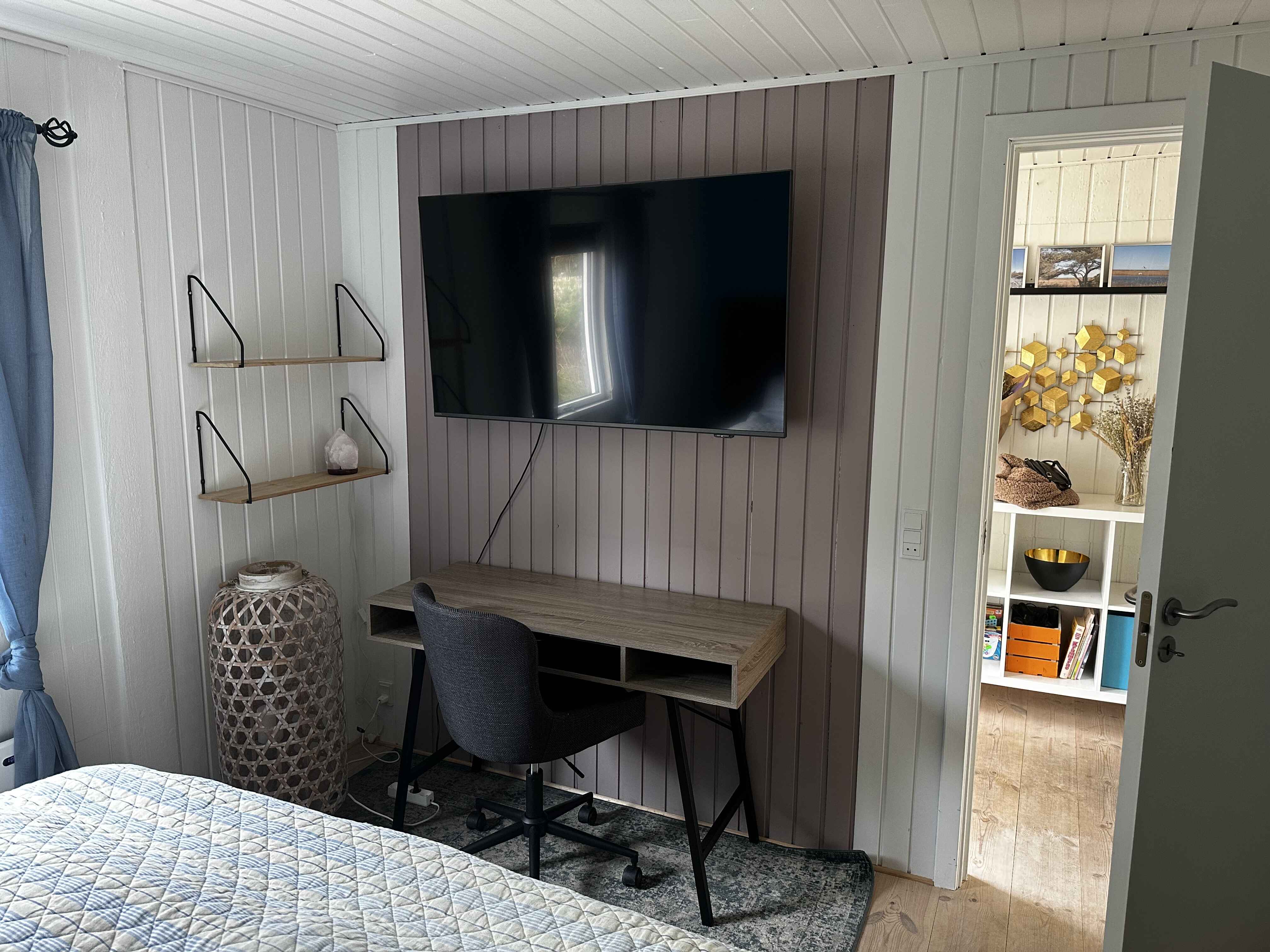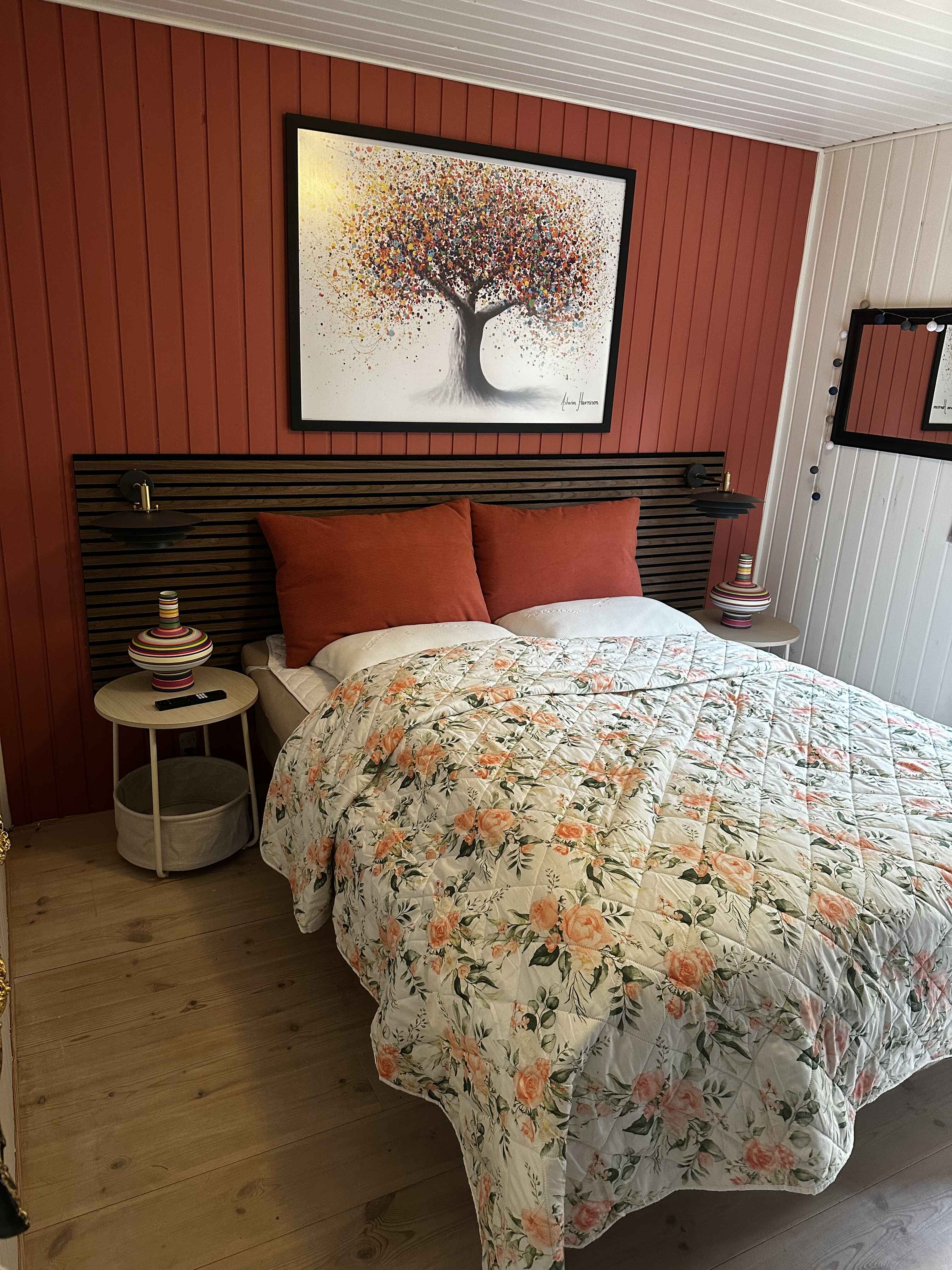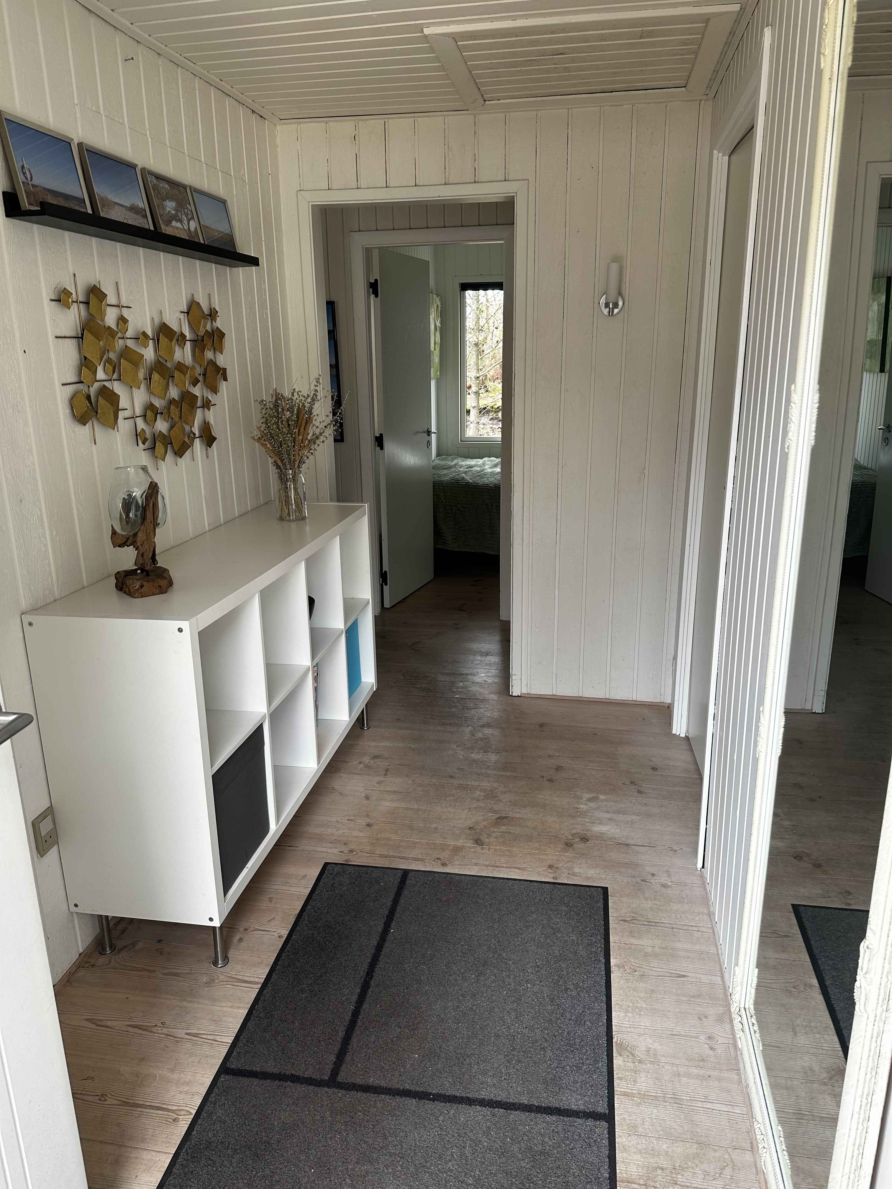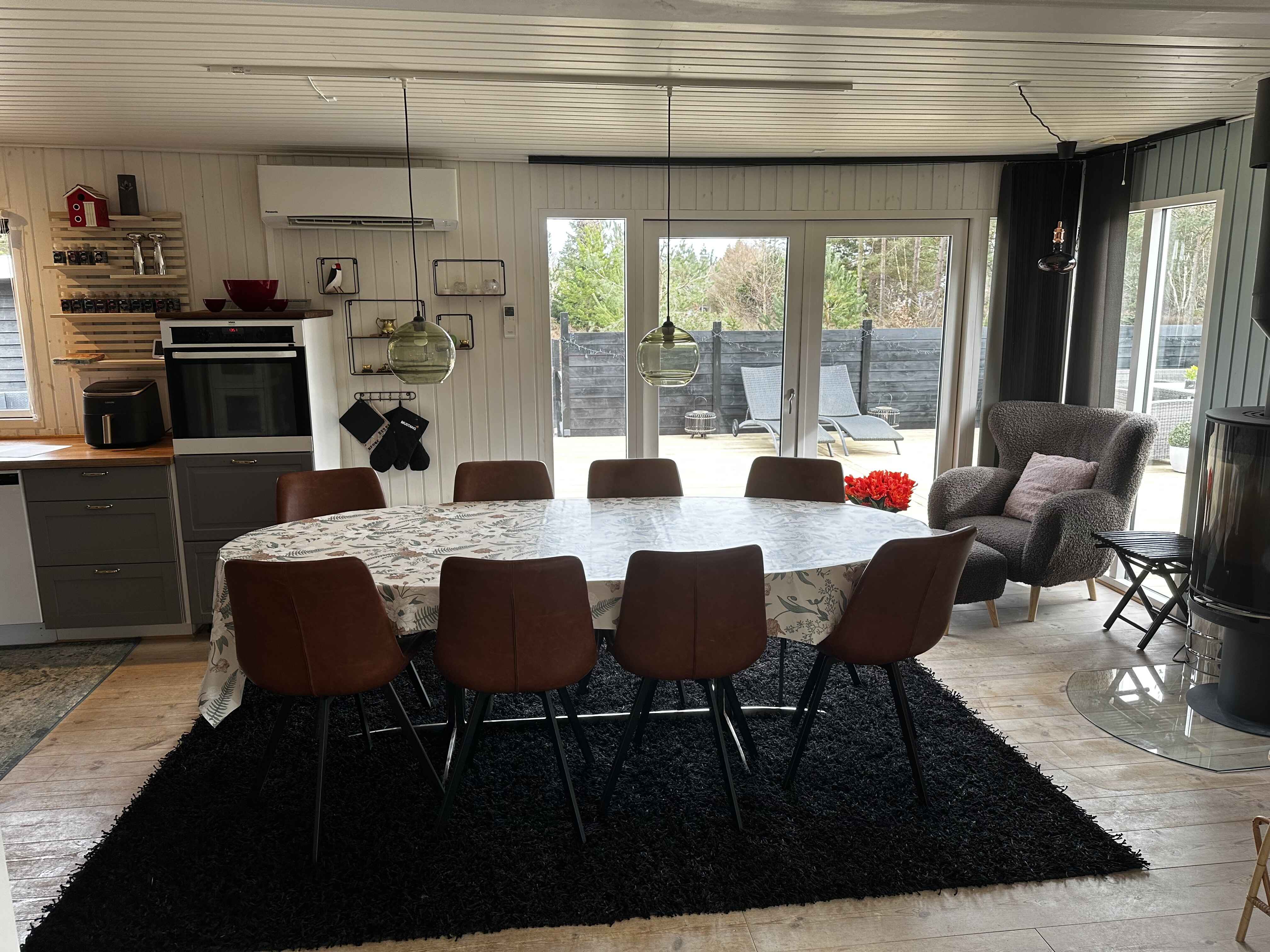 Inden døre er der lyst og ind­by­den­de, og man kan tydeligt mærke, at der er lagt vægt på at gøre rummene hyggelige og stem­nings­ful­de. Det gælder de fire soveværelser, der alle er udstyret med dob­belt­seng. 2 af soveværelserne er udstyret med TV med Chromecast. Stue og køkken ligger i åben for­bin­del­se. Her er der brændeovn og varme pumpe til even­tu­el­le kølige dage og aftener, og hvis I er i humør til en god film eller lidt let un­der­hold­ning, står der et TV med Chro­mecast placeret ved sofa afdelingen. Kort sagt meget be­ha­ge­li­ge rammer, ferie livet kommer til at udspille sig i.