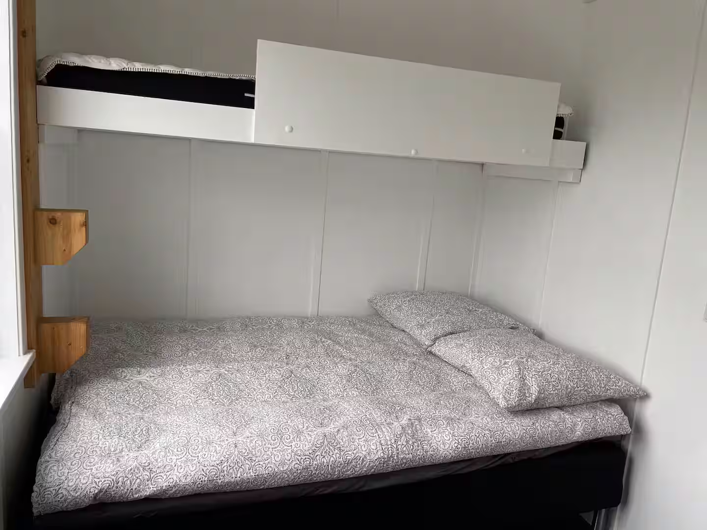 På første sal ligger to værelser og en hems. Det store værelse har dobbeltseng og skabe, mens det lille rummer en mindre dobbeltseng samt en ekstra seng ovenpå. Hemsen tilbyder en ekstra dobbeltseng. Alt inventar og alle møbler er fra renoveringen i 2021.